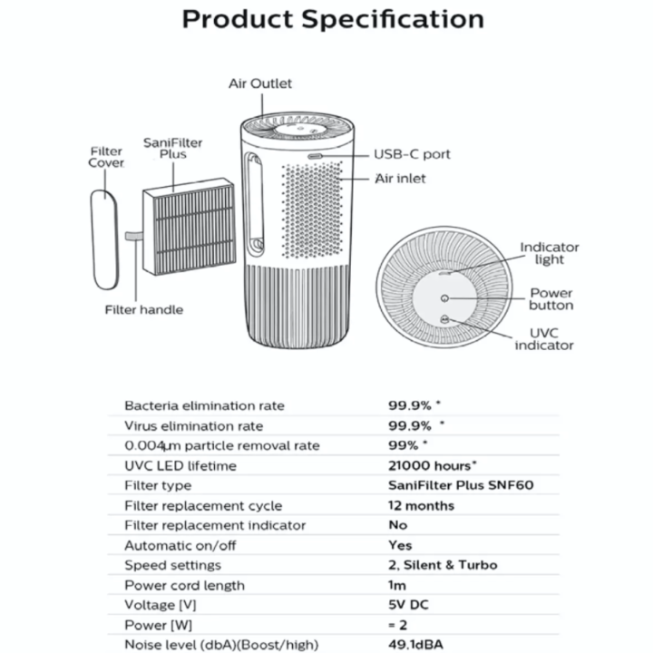 - Tấm lọc, màng lọc sử dụng công nghệ SaniFiler Plus đời mới nhất của Philips, lọc 3 giai đoạn mạnh mẽ độc đáo loại bỏ tới 125 chất gây ô nhiễm có hại và khí thải và các loại virut, thông qua các lớp HEPA và HESA. Được chứng nhận độc lập bởi Airmid Healthgroup, công nghệ SaniFilter Plus cũng loại bỏ tới 99% các hạt bụi siêu mịn và các chất gây dị ứng trong xe. Lọc hiệu quả các hạt nhỏ đến 0,004um, bao gồm các loại vi rút và vi khuẩn tức là nhỏ hơn 100 lần so với các loại virut thông thường .