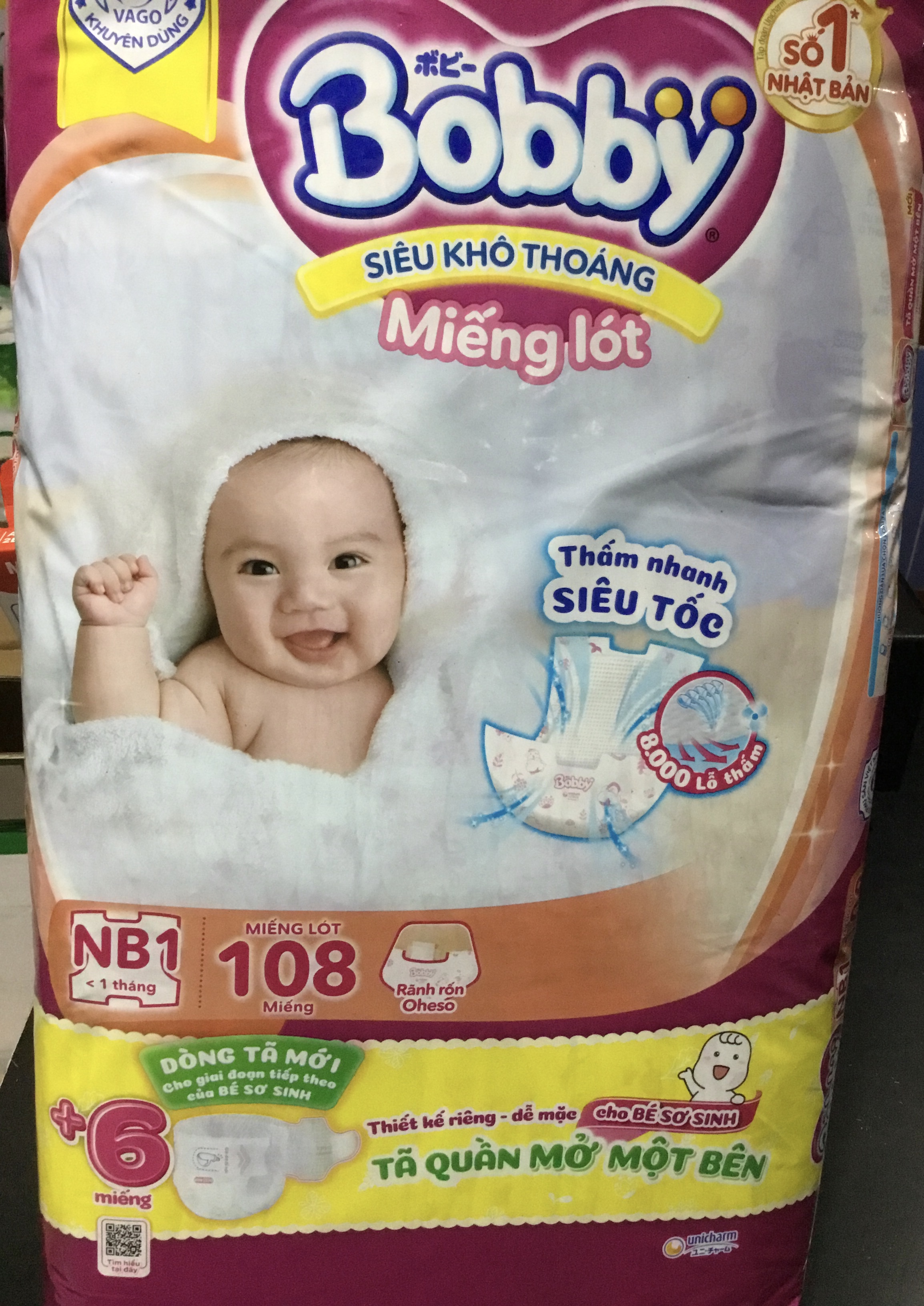Miếng Lót Bé Sơ Sinh Bobby Newborn 1 (NB1 108 ) 108 Miếng Cho Bé Lớn Dưới 1 Tháng - Tã Lót Trẻ Sơ Sinh NB 1 < 1 Tháng Miếng lót Bobby size Newborn 1 108 miếng là sản phẩm dành cho bé sơ sinh dưới 1 tháng tuổi thuộc thương hiệu Bobby đến từ tập đoàn Unicharm Nhật Bản. Miếng lót sơ sinh Bobby Newborn đột phá với giải pháp chống hăm toàn diện cùng khả năng thấm hút vượt trội. Chất liệu Vải không dệt, Hạt siêu thấm, Bông cellulose, PE, Chun, Polyme kết dính, Giấy tráng Silicon, Vitamin E dưỡng da Đặc điểm nổi bật Lớp thấm nhanh siêu tốc Miếng lót Bobby Newborn 1 cải tiến hơn về công nghệ giúp bề mặt với 8.000 lỗ thấm hút siêu nhanh cho da bé luôn khô thoáng Rãnh rốn Oheso Thiết kế rãnh hạn chế tối đa tiếp xúc giữa tã và cuống rốn, bảo vệ vùng rốn bé luôn khô thoáng Màng đáy xốp êm Màng đáy dạng vải êm mềm, thoát ẩm, cho da bé hô hấp tự nhiên, giảm nguy cơ hăm tã  Bề mặt Cotton-Soft Bề mặt siêu mềm mại với Cream Vitamin E chăm sóc nhẹ nhàng cho làn da bé sơ sinh Hướng dẫn sử dụng Hướng dẫn chọn miếng lót Size NB1( Newborn 1): bé dưới 1 tháng Size NB2 ( Newborn 2): bé trên 1 tháng Hướng dẫn bảo quản Bảo quản nơi khô ráo, tránh bụi và ánh nắng trực tiếp