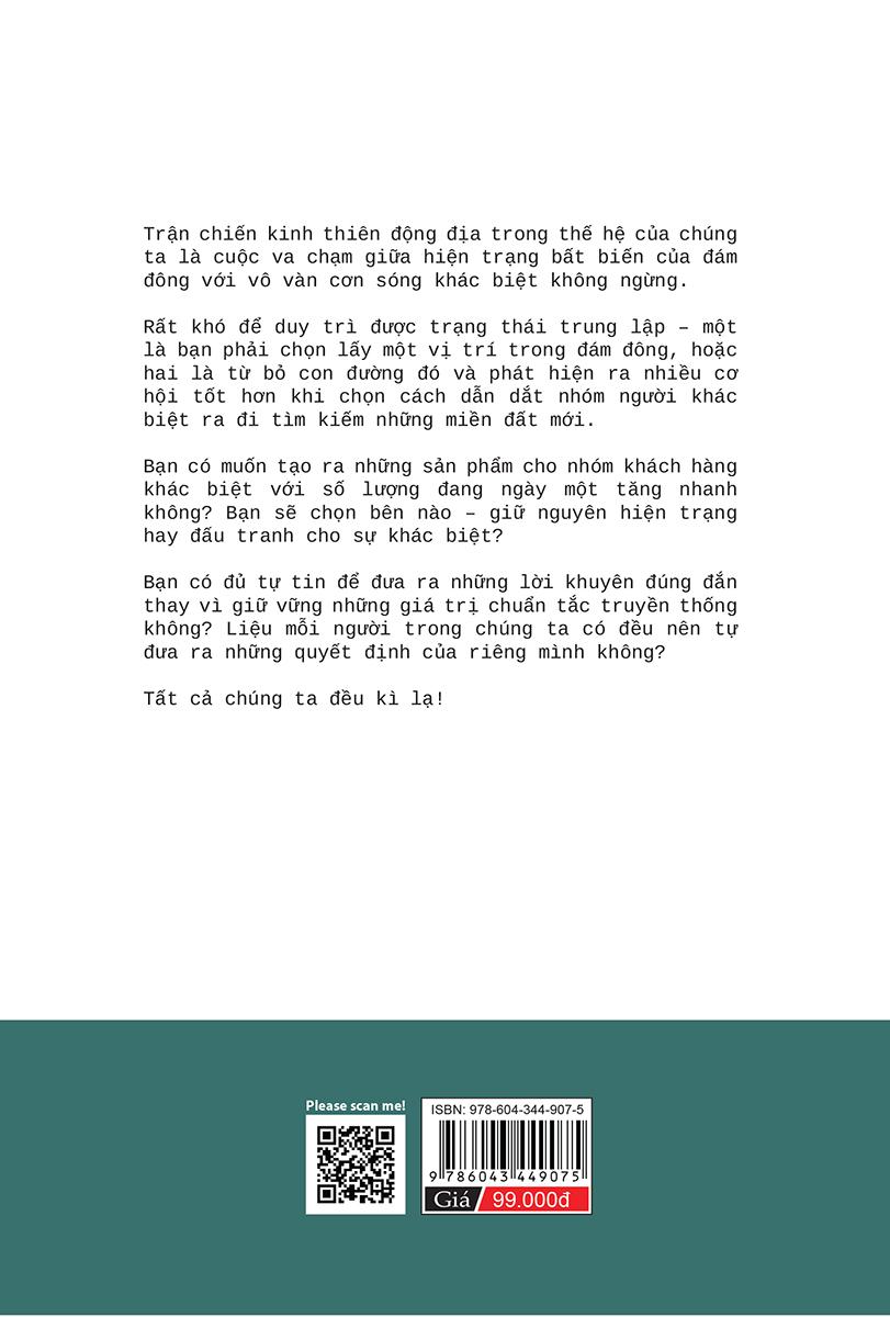 Tất Cả Chúng Ta Đề Kì Lạ Trận chiến kinh thiên động địa trong thế hệ của chúng ta là cuộc va chạm giữa hiện trạng bất biến của đám đông với vô vàn các cơn sóng khác biệt không ngừng. Rất khó để duy trì được trạng thái trung lập – một là bạn phải chọn lấy một vị trí trong đám đông, hoặc hai là từ bỏ con đường đó và phát hiện ra nhiều cơ hội tốt hơn khi chọn các dẫn dắt nhóm người khác biệt ra đi tìm kiếm những vùng đất mới. Bạn có muốn tạo ra những sản phẩm cho nhóm khách hàng khác biệt với số lượng đang ngày một tăng nhanh không? Bạn sẽ chọn bên nào – giữ nguyên hiện trạng hay tranh đấu cho sự khác biệt? Bạn có đủ tự tin để đưa ra những lời khuyên đúng đắn thay vì giữ vững những giá trị chuẩn tắc truyền thống không? Liệu mỗi người trong chúng ta có đều nên tự đưa những quyết định của riêng mình không? Tất cả chúng ta đều kỳ lạ!