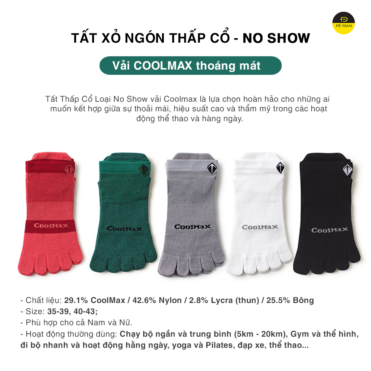 Tất xỏ ngón chạy bộ PÊ ĐAN SHOP thiết kế đặc biệt cho các hoạt động thể thao với chất liệu vải Coolmax công nghệ hiện đại giúp thoáng mát, thấm hút mồ hôi tốt đặc biệt chống phồng rộp khi hoạt động trong thời gian dài.