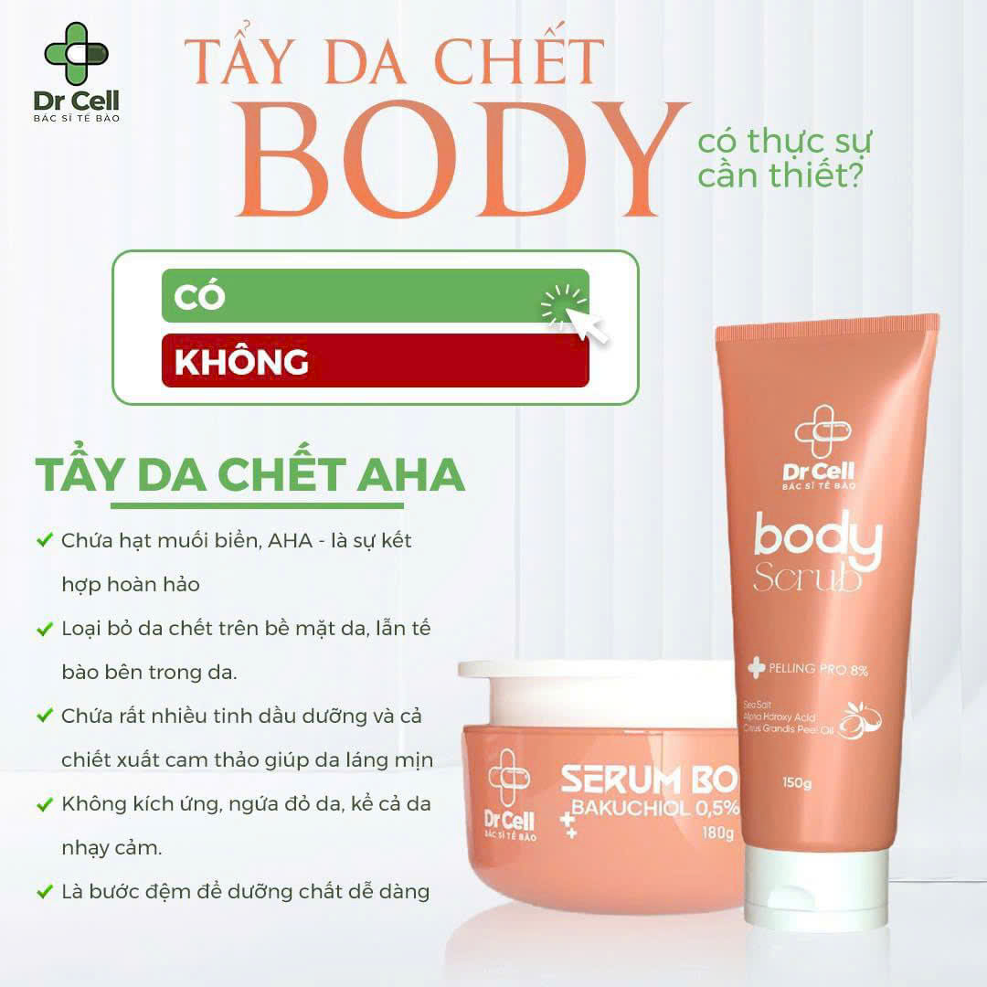 Dạng kem siêu nhẹ cùng AHA và các dưỡng chất tuyệt vời sẽ nhẹ nhàng lấy đi toàn bộ lớp tế bào chết trên bề mặt da, mang đến cho bạn làn da cơ thể mềm mại, mịn màng