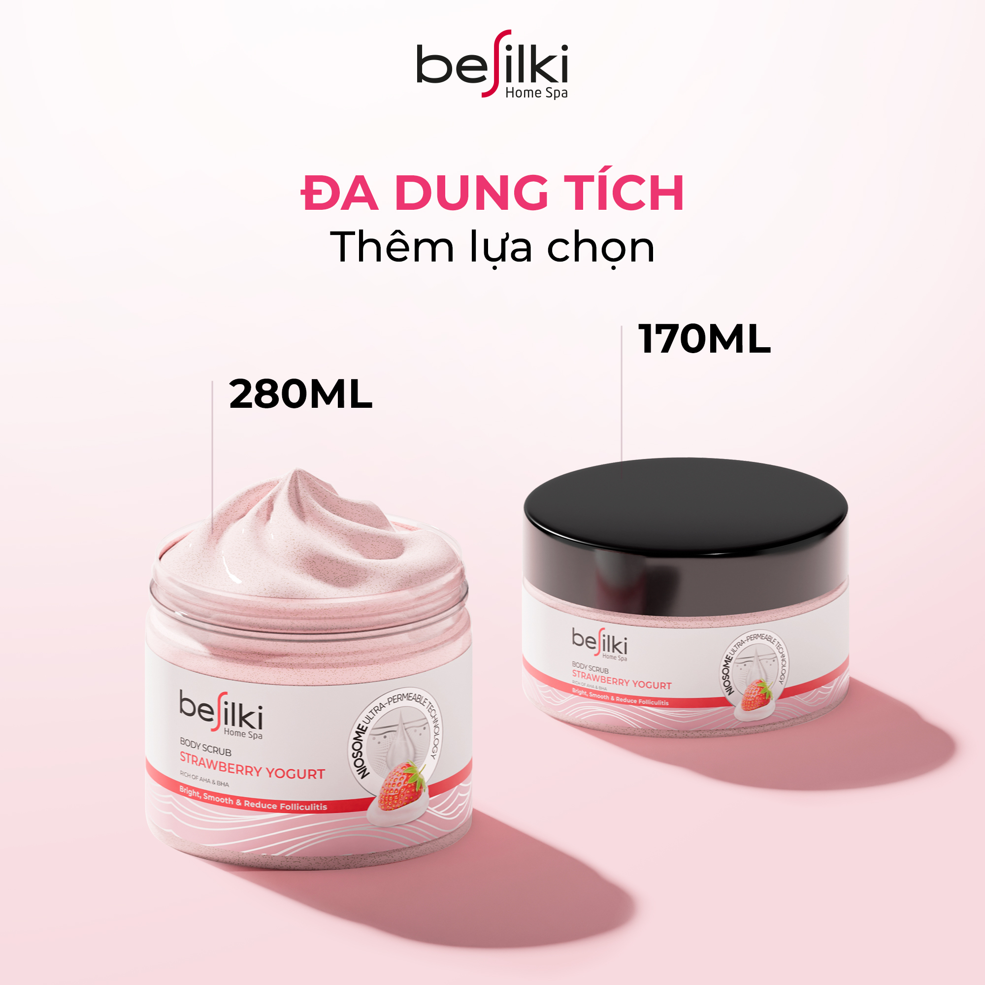 Kết hợp hoàn hảo giữa tẩy tế bào chết vật lý và hóa học, tẩy tế bào chết Sữa Chua Dâu Tây BeSilki Home Spa chứa hạt tẩy thiên nhiên nghiền mịn và hàm lượng AHA, BHA tự nhiên hỗ trợ loại bỏ tình trạng tắc nghẽn lỗ chân lông, tăng cường kháng khuẩn, ngăn ngừa viêm nang lông và mụn cơ thể.