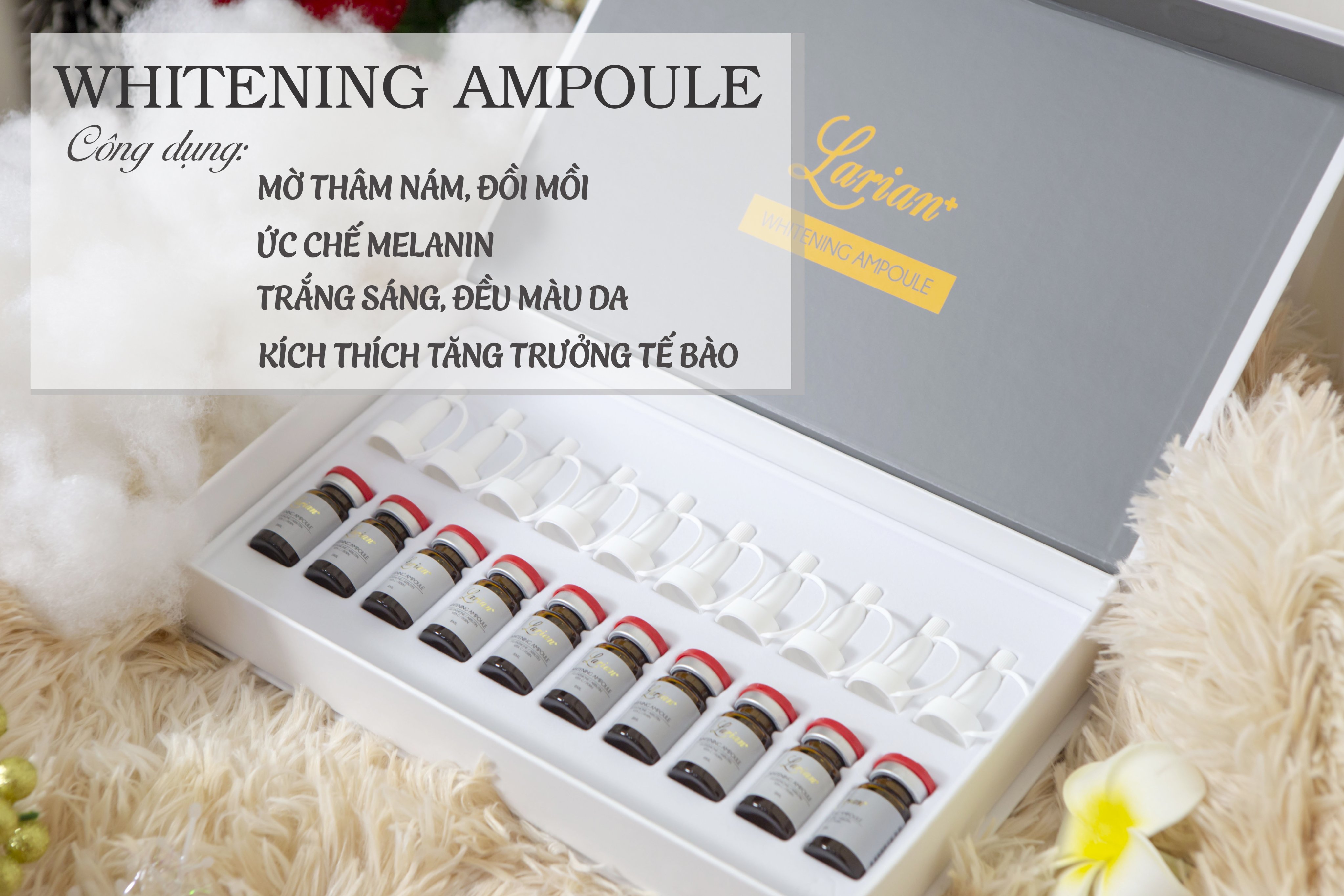 Whitening ampoule giúp ức chế sản xuất melanin, loại bỏ thâm nám, tàn nhang. Cung cấp các dưỡng chất làm trắng sáng da, đồng đều màu da. Tái tạo, phục hồi da bị tổn thương, da bị tăng sắc tố do sử dụng các loại mỹ phẩm nhiễm coticoir, do lăn kim, phi kim, laser…. Whitening ampoule cung cấp các axit amin cần thiết giúp kích thích sản sinh các tế bào da mới cho làn da khỏe mạnh và loại bỏ hiệu quả tình trạng nám, tàn nhang, các đốm đen, vết chân chim, các vùng da không đều màu, nuôi dưỡng da trắng sáng từ sâu bên trong. Sử dụng thường xuyên giúp bổ sung độ ẩm cho da, tạo lớp hàng rào bảo vệ giúp da tránh khỏi tình trạng mất nước, thô ráp, bong tróc, se khít lỗ chân lông, tăng cường độ đàn hồi cũng như xóa mờ các nếp nhăn…
