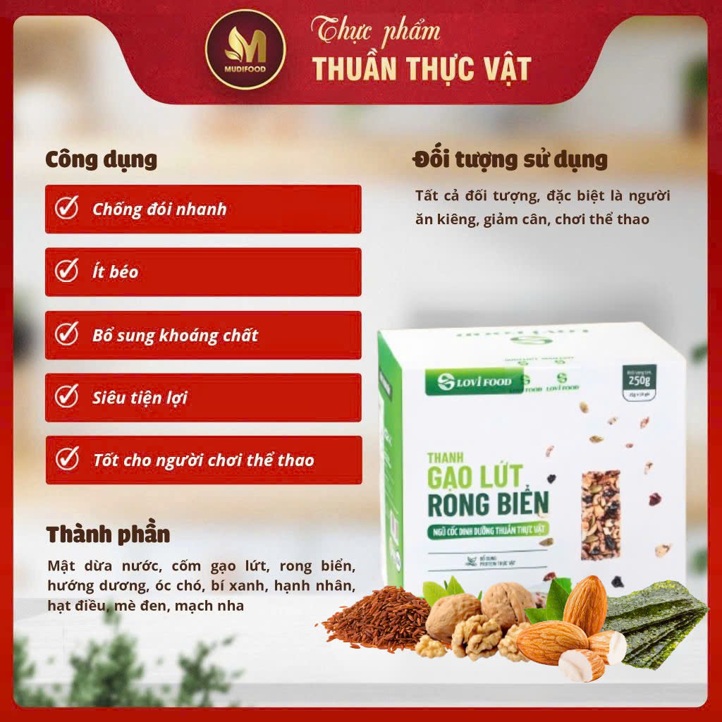 - Tên sản phẩm: Thanh Gạo Lứt Rong Biển Lolifood 250g (25g x 10 gói) * Thành phần: Mật dừa nước, cốm gạo lứt, rong biển, hướng dương, óc chó, bí xanh, hạnh nhân, hạt điều, mè đen, mạch nha.