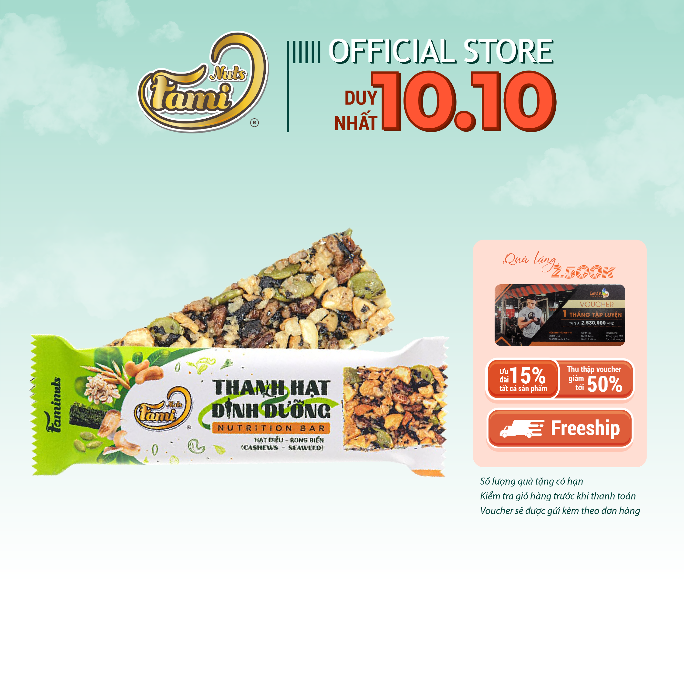 THÔNG TIN SẢN PHẨM THANH HẠT DINH DƯỠNG VỊ HẠT ĐIỀU & RONG BIỂN FAMINUTS Thanh hạt dinh dưỡng ít calo - bữa ăn sáng tiện lợi Đa dạng sự lựa chọn với nhiều hương vị Thành phần: Kết hợp nhiều loại hạt dinh dưỡng
