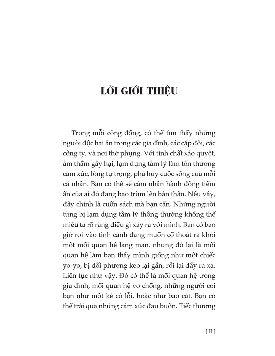 Shannon Thomas giới thiệu những kiến thức cơ bản về đặc điểm, các dạng của lạm dụng tâm lý nói chung, thao túng tâm lý nói riêng, và cung cấp cho người đọc hành trình chữa lành gồm 6 giai đoạn: