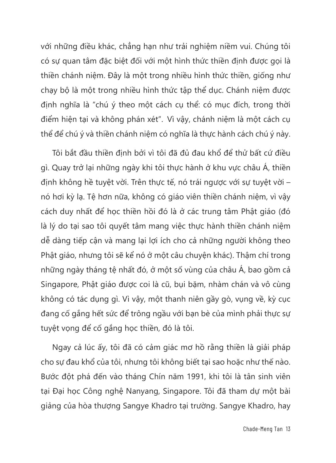 Chade-Meng Tan (thường được gọi thân mật là “Meng”) là một trong những kỹ sư đầu tiên tại Google và hiện đã nghỉ hưu, nơi ông có chức danh chính thức là “Jolly Good Fellow (Which nobody can deny)” – Tạm dịch: Vui vẻ hòa đồng (Mà không ai có thể phủ nhận). Một trong những dự án chính của Chade-Meng Tan tại Google là “Search Inside Yourself” – một khóa học về trí tuệ cảm xúc dựa trên chánh niệm. Là một người thiền định nhiệt thành, ông luôn cống hiến hết m.ình để thúc đẩy Hòa bình, Tự do, Khai sáng và Hạnh phúc.