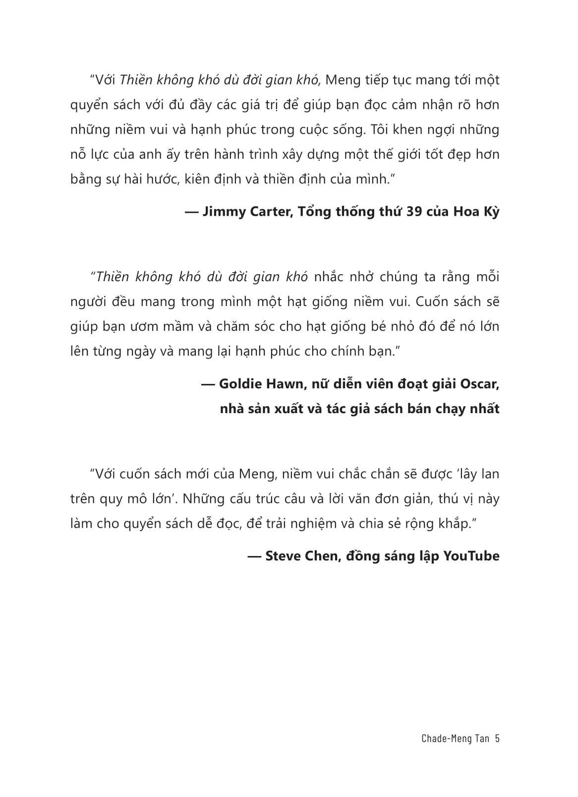 “Với ‘Thiền không khó dù đời gian khó’, Meng tiếp tục mang tới một quyển sách với đủ đầy các giá trị để giúp bạn đọc cảm nhận rõ hơn những niềm vui và hạnh phúc trong cuộc sống. Tôi khen ngợi những nỗ lực của anh ấy trên hành trình xây dựng một thế giới tốt đẹp hơn bằng sự hài hước, kiên định và thiền định của m.ình.” — Jimmy Carter, Tổng thống thứ 39 của Hoa Kỳ