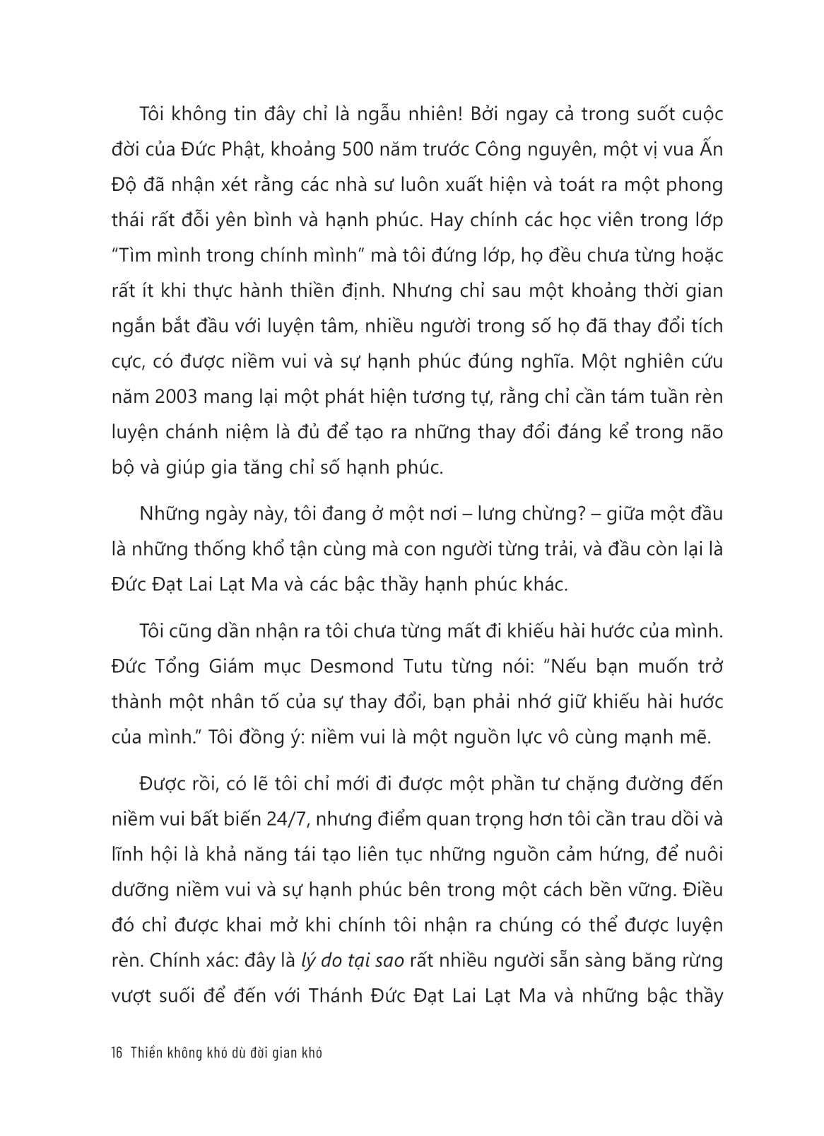 “Thiền không khó dù đời gian khó nhắc nhở chúng ta rằng mỗi người đều mang trong m.ình một hạt giống niềm vui. Cuốn sách sẽ giúp bạn ươm mầm và chăm sóc cho hạt giống bé nhỏ đó để nó lớn lên từng ngày và mang lại hạnh phúc cho chính bạn.” — Goldie Hawn, nữ diễn viên đoạt giải Oscar, nhà sản xuất và tác giả sách bán chạy nhất
