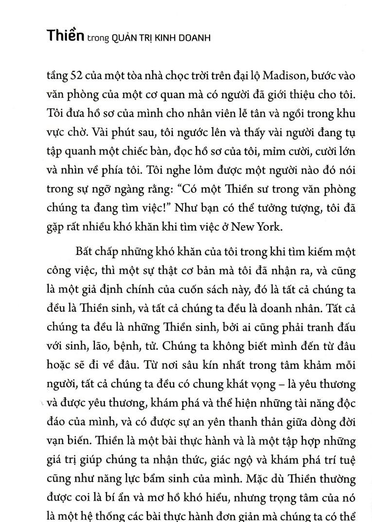 "Thiền Đình" và "Kinh Doanh" là hai khái niệm tưởng chừng như hoàn toàn khác biệt.Nhưng dưới con mắt của Marc Leser - một doanh nhân tự tay gây dựng doanh nghiệp của riêng mình,và củng là một thiền sư đã hành Thiền trong hơn 30 năm - thì mối liên kết giữa hai khai niệm này lại vô cùng chặt chẽ,và "tất cả chúng ta đều là thiền sinh,tất cả chúng ta đều là doanh nhân"