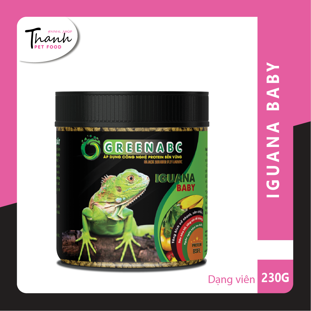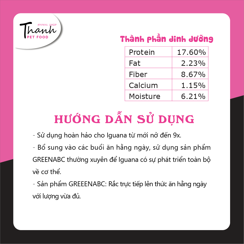 GREENABC - THỨC ĂN IGUANA BABY - Rồng Nam Mỹ Baby từ mới nở đến 9x.  GREENABC là thức ăn cao cấp dành cho Iguana Baby - Rồng Nam Mỹ Baby Đặc biệt sản phẩm GREENABC được sản xuất theo phương pháp Áp dụng công nghệ PROTEIN bền vững từ bột đạm G.Meal rất giàu PROTEIN – CANXI – LIPID có trong BSFL, đã được Mỹ (AAFCO) và EU chấp nhận đưa vào công thức cho ngành sản xuất thức ăn dành cho vật nuôi. Sản phẩm GREENABC cung cấp các giá trị dinh dưỡng bền vững cho Iguana với sự kết hợp 80% thành phần có nguồn gốc thực vật và 20% thành phần có nguồn gốc động vật từ côn trùng, giúp cho Iguana Baby:      + Lột da thường xuyên, tăng kích cỡ nhanh, lên màu đẹp.      + Với hàm lượng Canxi 100% nguyên chất có trong BSFL giúp gai bung, đều, ngăn ngừa các bệnh thường gặp như teo đuôi, MBD, sạn, ...      + Kích thích khứu giác, tăng cường vị giác, giúp Iguana ăn ngon miệng hơn. Đặc biệt với hương thơm tự nhiên, Greenabc kích thích khứu giác của các Iguana Abino T-, giúp các bé ăn tốt hơn.       + Tiêu hóa tốt, cơ thể hấp thụ toàn bộ dưỡng chất cần thiết, giúp cơ thể phát triển toàn diện.      + Cơ thể săn chắc, khỏe mạnh.      + Giảm thiểu mùi hôi của phân và cơ thể. Combo 1:  Combo 2:  Combo 3:  Thành phần dinh dưỡng và hướng dẫn sử dụng:  Ghi chú: Khi sử dụng combo Iguana Baby 3, KHÔNG CẦN BỔ SUNG THÊM CANXI VÀ D3 cho Iguana, vì trong combo Iguana Baby 3 đã đầy đủ lượng Canxi cho Igu phát triển. Quý khách hàng sẽ SIÊU TIẾT KIỆM CHI PHÍ cho việc chăm sóc cho Iguana.