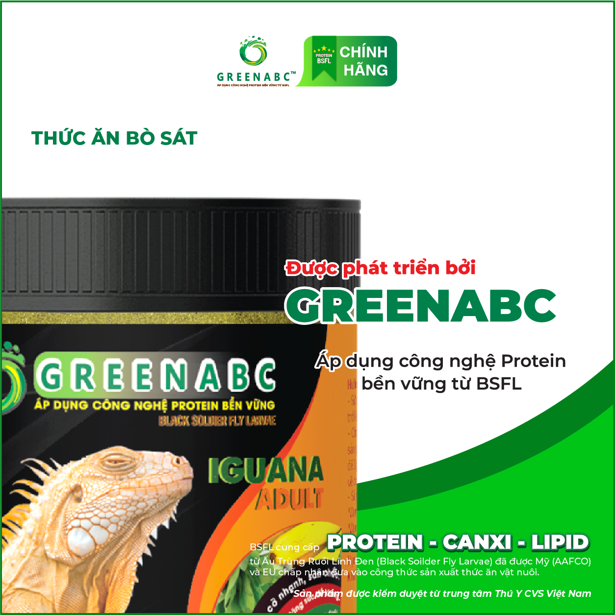 THỨC ĂN BÒ SÁT - BỔ SUNG DINH DƯỠNG PROTEIN, CANXI, LIPID GREENABC là thức ăn cao cấp dành cho các loại bò sát: IGUANA, BEARDED DRAGON, LEOPARD GECKO. Đặc biệt sản phẩm GREENABC được