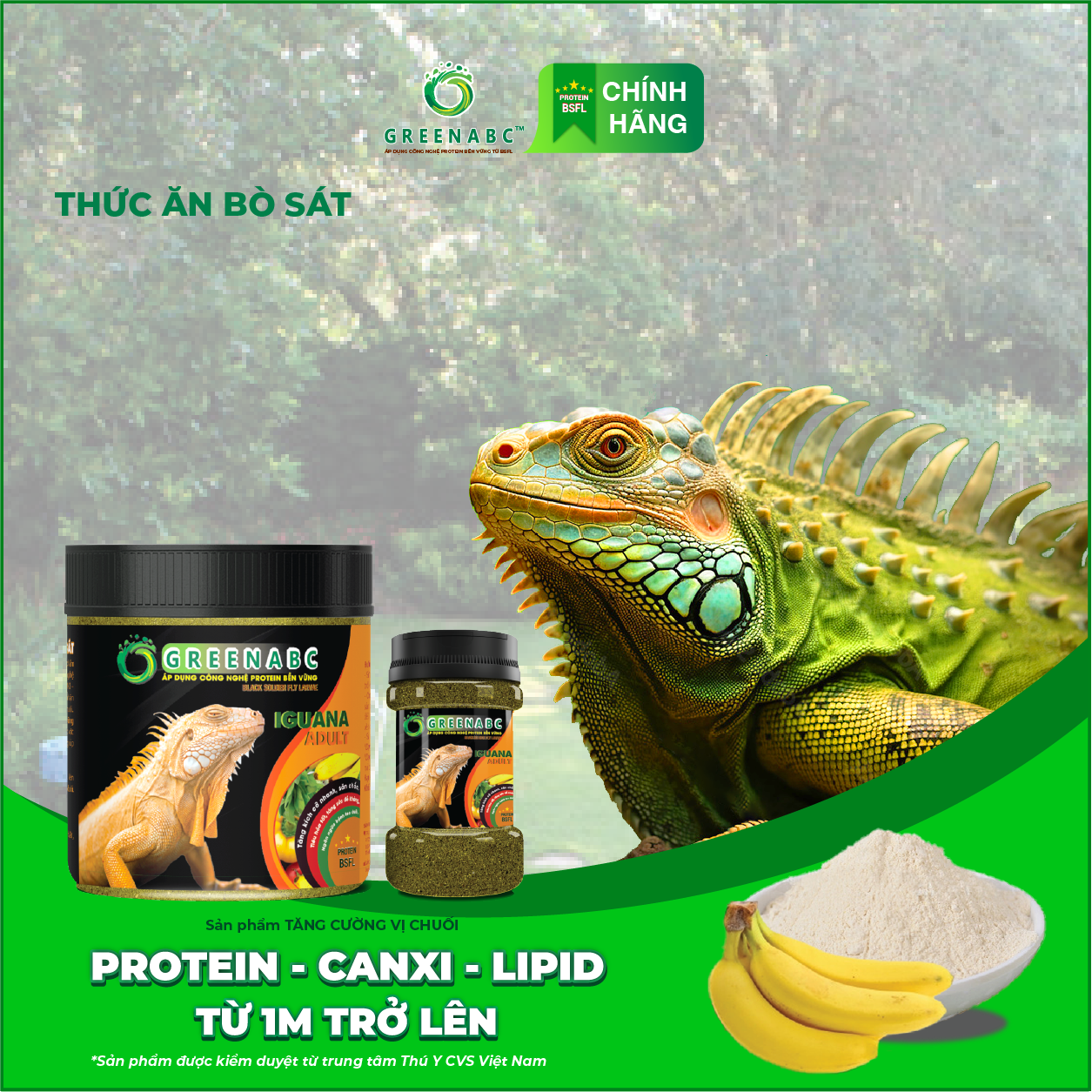 GREENABC - THỨC ĂN IGUANA TRƯỞNG THÀNH VỊ CHUÔI- Rồng Nam Mỹ trưởng thành từ 1m trở lên GREENABC là thức ăn cao cấp dành cho Iguana Trưởng Thành - Rồng Nam Mỹ Trưởng Thành. Đặc biệt sản phẩm GREENABC được sản xuất theo phương pháp Áp dụng công nghệ PROTEIN bền vững từ bột đạm G.Meal rất giàu PROTEIN – CANXI – LIPID có trong BSFL, đã được Mỹ (AAFCO) và EU chấp nhận đưa vào công thức cho ngành sản xuất thức ăn dành cho vật nuôi. Sản phẩm GREENABC cung cấp các giá trị dinh dưỡng bền vững cho Iguana với sự kết hợp 90% thành phần có nguồn gốc thực vật và 10% thành phần có nguồn gốc động vật từ côn trùng, giúp cho Iguana: