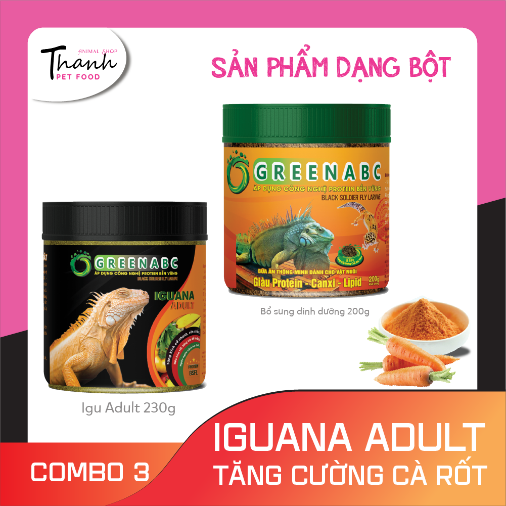 GREENABC - THỨC ĂN IGUANA TRƯỞNG THÀNH VỊ CÀ RỐT- Rồng Nam Mỹ trưởng thành từ 1m trở lênGREENABC là thức ăn cao cấp dành cho Iguana Trưởng Thành - Rồng Nam Mỹ Trưởng Thành. Đặc biệt sản phẩm GREENAB...