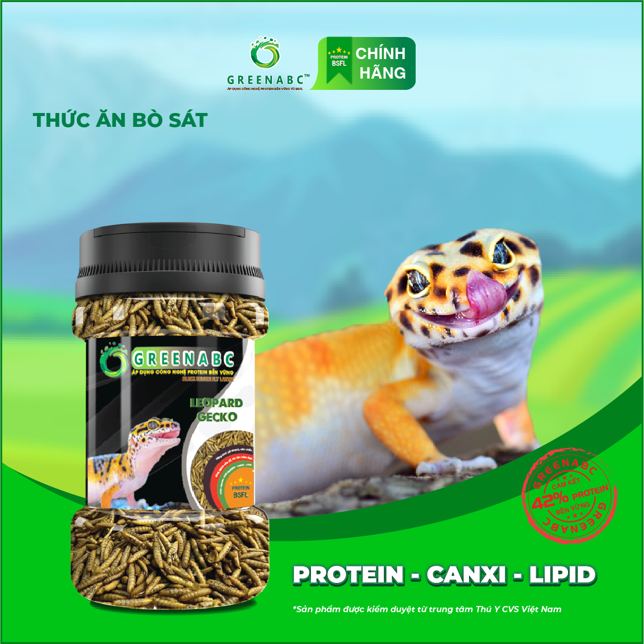 GREENABC - THỨC ĂN DÀNH CHO THẰN LẰN DA BÁO - BỔ SUNG DINH DƯỠNG PROTEIN - CANXI - LIPID GREENABC là thức ăn bổ dưỡng dành cho THẰN LẰN DA BÁO. Đặc biệt sản phẩm GREENABC được sản xuất theo phương pháp Áp dụng công nghệ PROTEIN bền vững rất giàu PROTEIN – CANXI – LIPID có trong BSFL, đã được Mỹ (AAFCO) và EU chấp nhận đưa vào công thức cho ngành sản xuất thức ăn dành cho vật nuôi. Sản phẩm GREENABC cung cấp các giá trị dinh dưỡng bền vững cho vật nuôi, giúp cho Thằn Lằn Da Báo: