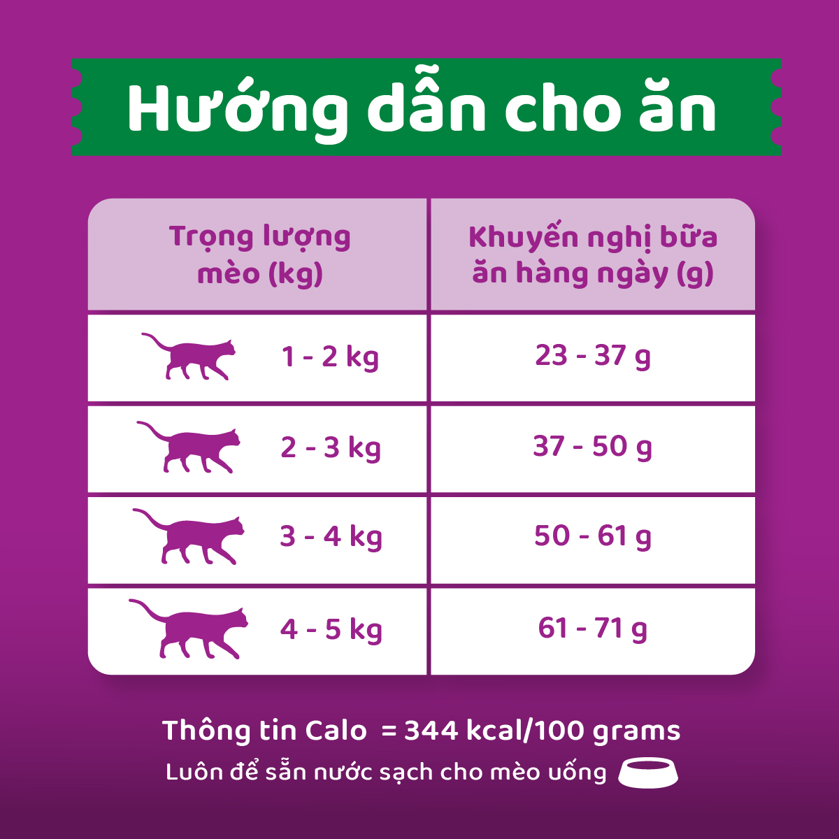 Mỗi 100g thức ăn cho mèo, dạng hạt khô, cung cấp 354 kcal năng lượng, đảm bảo dinh dưỡng đầy đủ và cân bằng cho mèo của bạn. Bạn có thể linh hoạt cho mèo ăn một hoặc hai lần lượng thức ăn khuyến nghị hàng ngày, tùy thuộc vào nhu cầu của chúng. Hãy chủ động điều chỉnh lượng ăn phù hợp với mức độ hoạt động của mèo. Luôn cung cấp nước sạch cho mèo uống để đảm bảo sức khỏe.