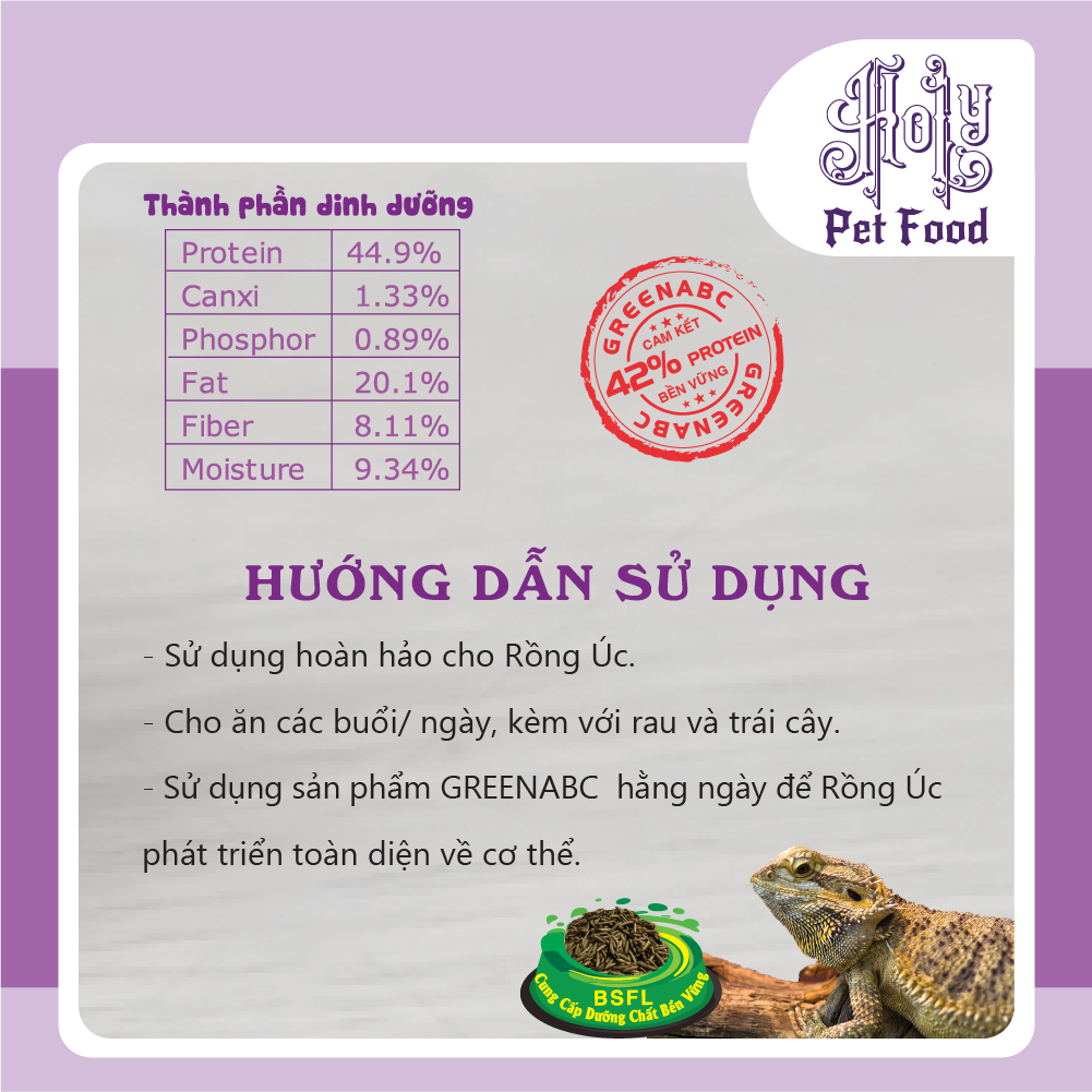 THỨC ĂN RỒNG ÚC, RỒNG RÂU - BỔ SUNG DINH DƯỠNG PROTEIN, CANXI, LIPID GREENABC là thức ăn cao cấp dành cho các loại Rồng Úc, Rồng Râu. Đặc biệt sản phẩm GREENABC được sản xuất theo phương pháp Áp dụng công nghệ PROTEIN BỀN VỮNG từ bột đạm G.Meal rất giàu PROTEIN–CANXI–LIPID có trong BSFL*, đã được Mỹ (AAFCO) và EU chấp nhận đưa vào công thức cho ngành sản xuất thức ăn dành cho thú cưng. Sản phẩm GREENABC cung cấp các giá trị dinh dưỡng bền vững cho thú cưng, giúp cho Rồng Râu / Úc:       + Kích thích vị giác, đặc biệt trong thời kì sinh sản giúp ăn ngon miệng hơn.       + Tăng cường sức đề kháng ngăn ngừa bệnh tật, tăng khả năng sinh sản.       + Tiêu hóa tốt, cơ thể hấp thu các dưỡng chất tối ưu. Đặc biệt với hàm lượng Canxi cao, sản phẩm GREENABC giúp cơ thể phát triển toàn diện về khung xương, gai đều.       + Kích thích sắc tố, giúp Rồng Úc lên màu đẹp.       + Cơ thể cân đối, săn chắc. Phân loại & hướng dẫn sử dụng sản phẩm: + Rồng Úc 68g: cho bé sử dụng hằng ngày như 1 món ăn yêu thích + Combo Rồng Úc 1, Combo Rồng Úc 2: => Rồng Úc 68g: cho bé sử dụng hằng ngày như 1 món ăn yêu thích => Thức ăn Bổ Sung Dinh Dưỡng 40g / 200g: tập thói quen cho bé ăn rau, trái cây hằng ngày, vì sản phẩm khi rắc lên rau, trái cây rất kích thích khứu giác và vị giác ăn ngon miêng. Lưu ý: khi sử dụng GREENABC - Thức ăn dinh dưỡng dành cho Thằn Lằn Da Báo, KHÔNG CẦN BỔ SUNG THÊM CANXI cho các bé. Vì sản phẩm có đầy đủ dưỡng chất PROTEIN - CANXI - LIPID có từ BSFL