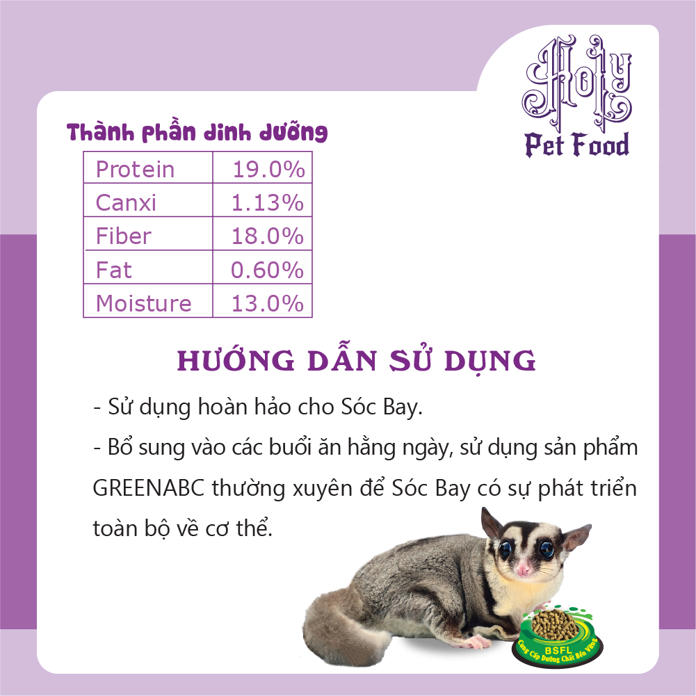 GREENABC - THỨC ĂN SÓC BAY - LÔNG MƯỢT, TĂNG CƯỜNG SỨC KHỎE GREENABC là thức ăn cao cấp dành cho SÓC BAY. Đặc biệt sản phẩm GREENABC được sản xuất theo phương pháp Áp