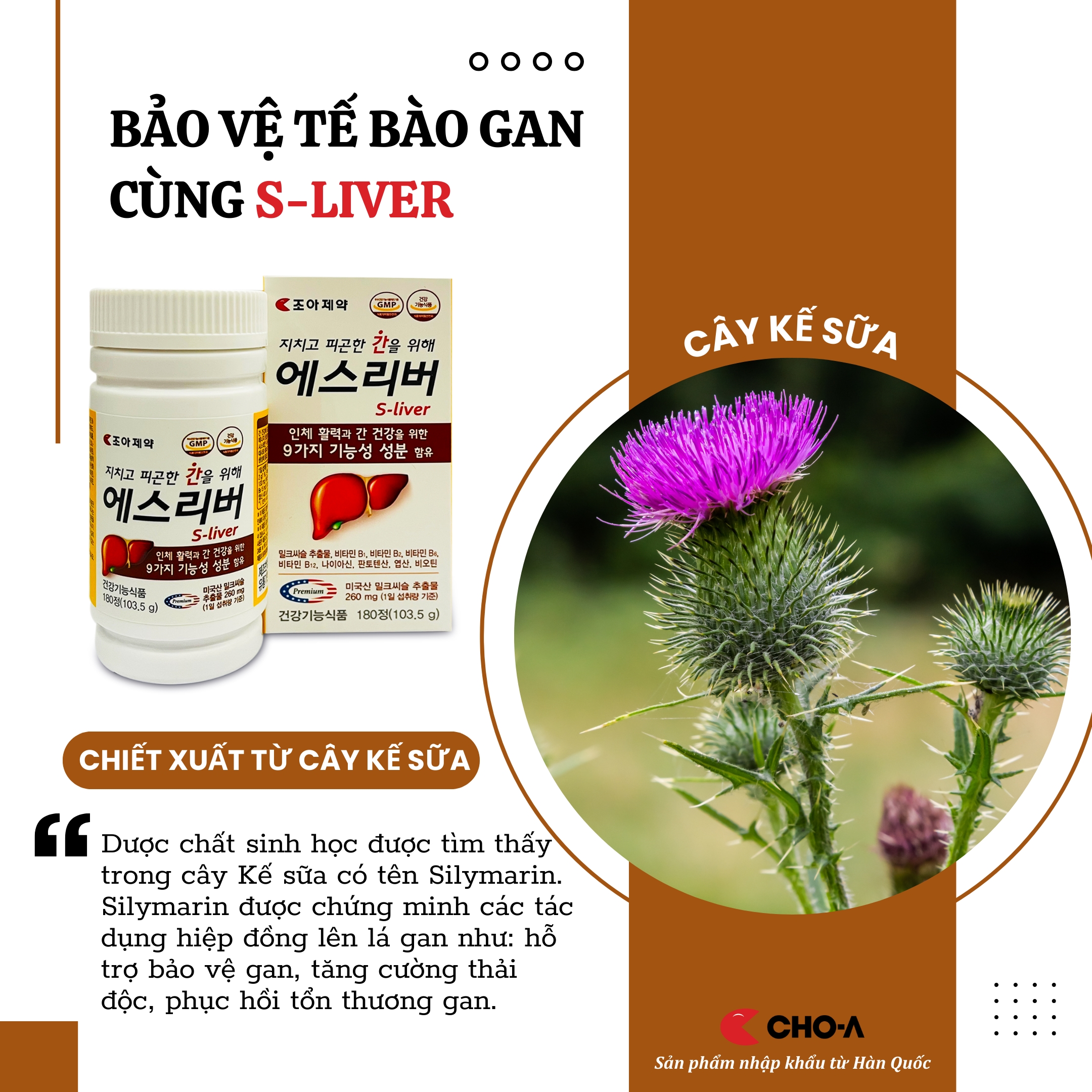 THỰC PHẨM BẢO VỆ SỨC KHỎE GAN S-LIVER TĂNG CƯỜNG CHỨC NĂNG GAN (1 HỘP x 180 VIÊN) S-LIVER là sản phẩm dành cho gan với chiết xuất từ cây kế sữa, hỗn hợp các loại vitamin,... được sản xuất theo quy trình chất lượng chuẩn của Hàn Quốc trên dây chuyền công nghệ hiện đại. Công Dụng: