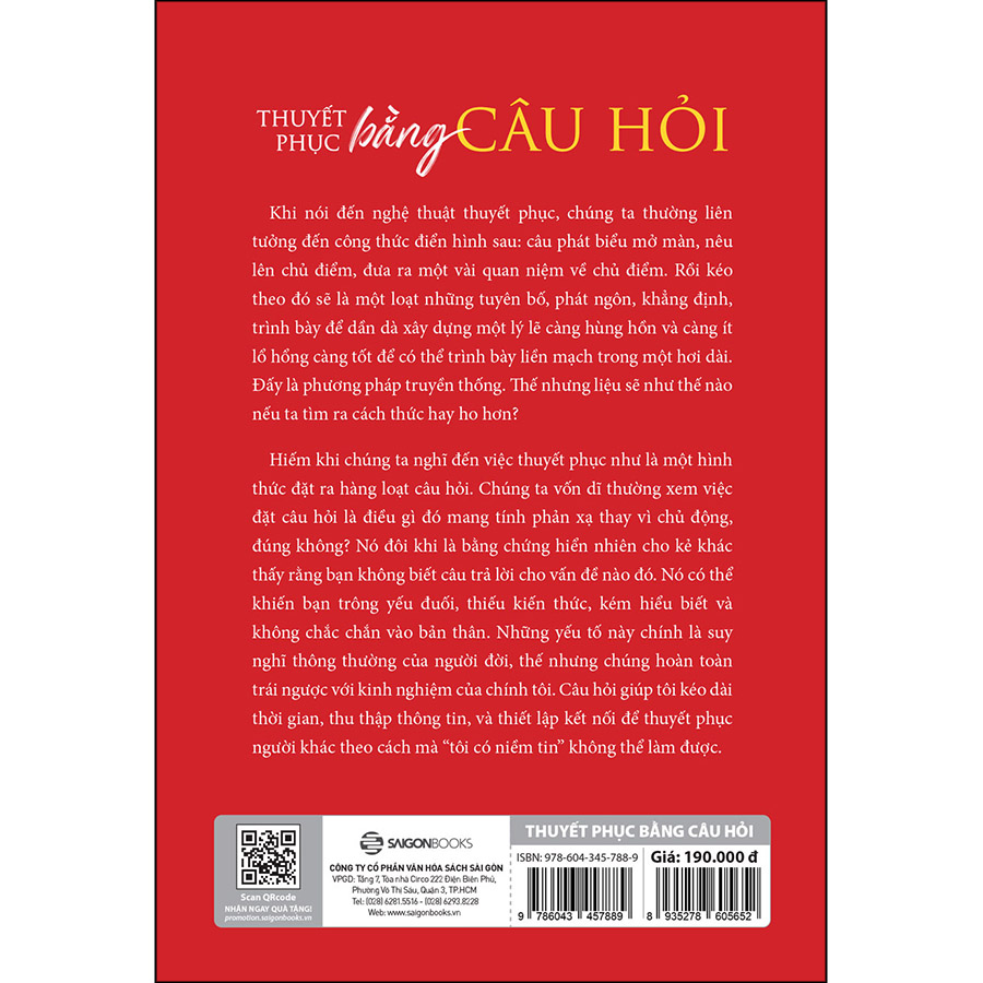 Quyển sách Thuyết phục bằng câu hỏi cung cấp các công cụ và tư duy để chúng ta có thể truyền đạt đúng thông điệp của mình, đặc biệt trong đó có kỹ thuật để đặt câu hỏi - không phải để có đáp án mà để được người khác lắng nghe, thấu hiểu và từ đó thay đổi người đối diện.