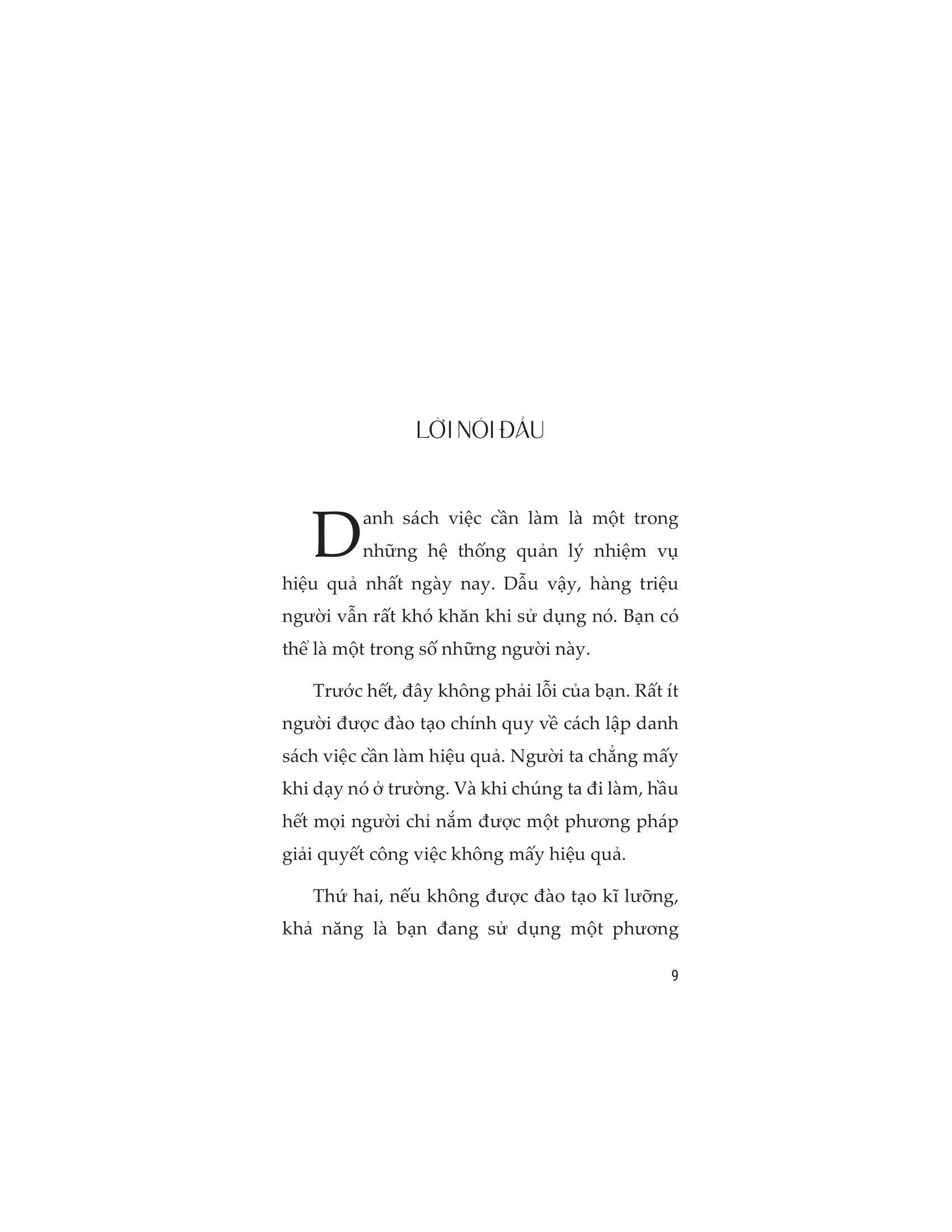 - Bạn thường xuyên hay quên và trễ deadline? Hàng triệu người cũng rơi vào cảnh giống như bạn - tức là không thể lập và sử dụng danh sách việc cần làm một cách hợp lý. Để học tập và làm việc hiệu quả, bạn cần có “TO DO LIST” hữu ích. “To do list” là danh sách các việc bạn liệt kê, thực hiện và giám sát chính m.ình để hoàn thành mục tiêu công việc hiệu quả, đúng kế hoạch. Tạo lập “To do list” hiệu quả giúp bạn không bị rối, mọi việc được làm đảm bảo theo thứ tự rõ ràng, theo thứ tự ưu tiên việc quan trọng. Trong cuốn sách “TO DO LIST – Phương pháp lập kế hoạch công việc và quản lý thời gian hiệu quả”, tác giả Damon Zahariades sẽ trình bày một công thức ngắn gọn và thực tế để giúp bạn tổ chức, quản lý và giải quyết từng nhiệm vụ quan trọng của bản thân để cải thiện tối đa năng suất. Bạn đọc có thể dễ dàng kiểm tra tiến độ làm việc của m.ình trong một ngày, tuần, tháng,… cũng như kiểm soát được tổng thể công việc. Với cuốn sách TO DO LIST, bạn sẽ khám phá: