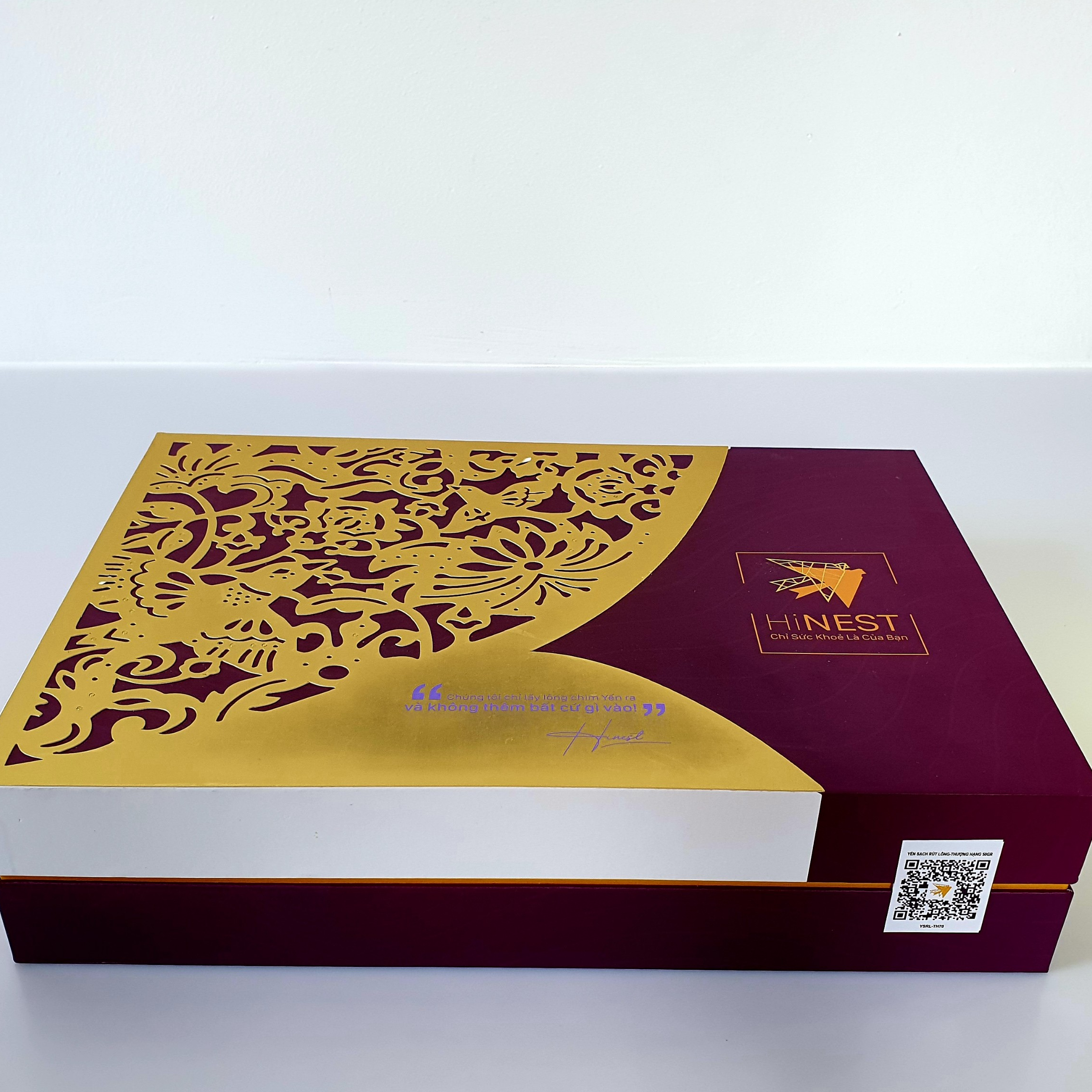 Hộp gỗ chữ nhật kích thước 31x22x8 (cm) Gồm 12 phần yến, mỗi phần 1,5 g + 12 gói đường phèn, mỗi gói 7 g Tặng kèm 12 hũ thủy tinh tiệt trùng dùng để