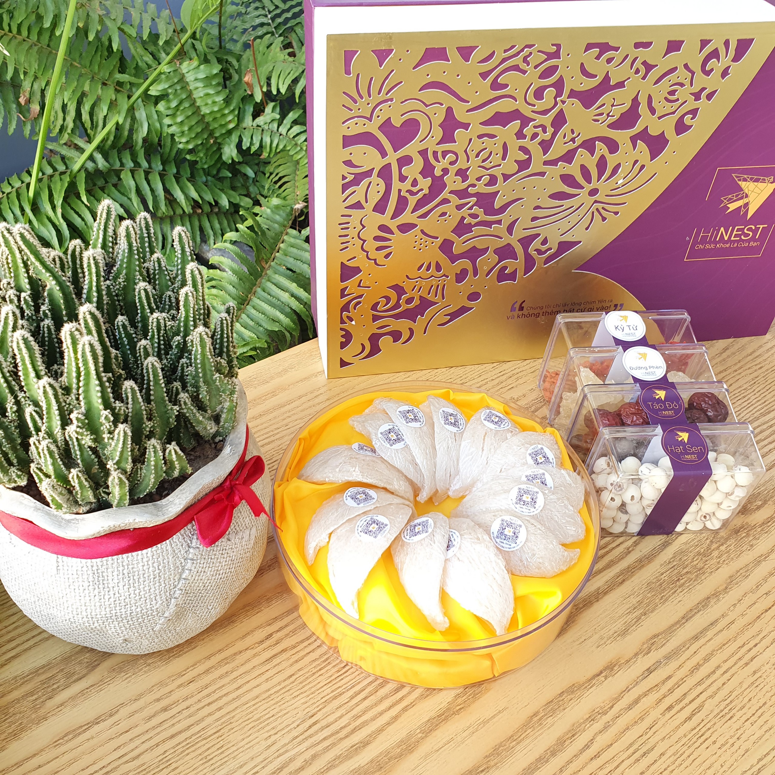 Hộp giấy lục giác kích thước 3x3x7 (cm) Gồm 1 phần yến 1,5 g + 1 gói đường phèn 7 g Tặng kèm 1 hũ thủy tinh tiệt trùng dùng để chưng yến 100% yến
