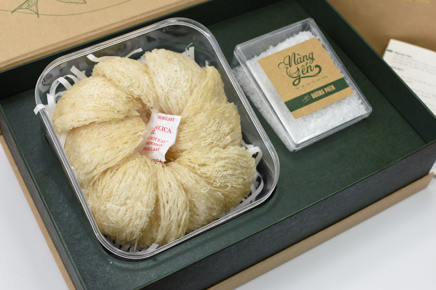 Nhặt sạch lông, tạp chất, và cho vào khuôn sấy quạt tự nhiên trong môi trường khô thoáng để đạt độ khô ráo chuẩn trước khi đóng gói. Với phương pháp làm sạch lông của Nàng Yến, sợi yến của tổ yến tinh chế vẫn còn giữ được mùi thơm nồng, đặc trưng của yến, tỉ lệ sợi yến giữ lại cao, được phơi sấy ở nơi thoáng đãng và khô ráo.