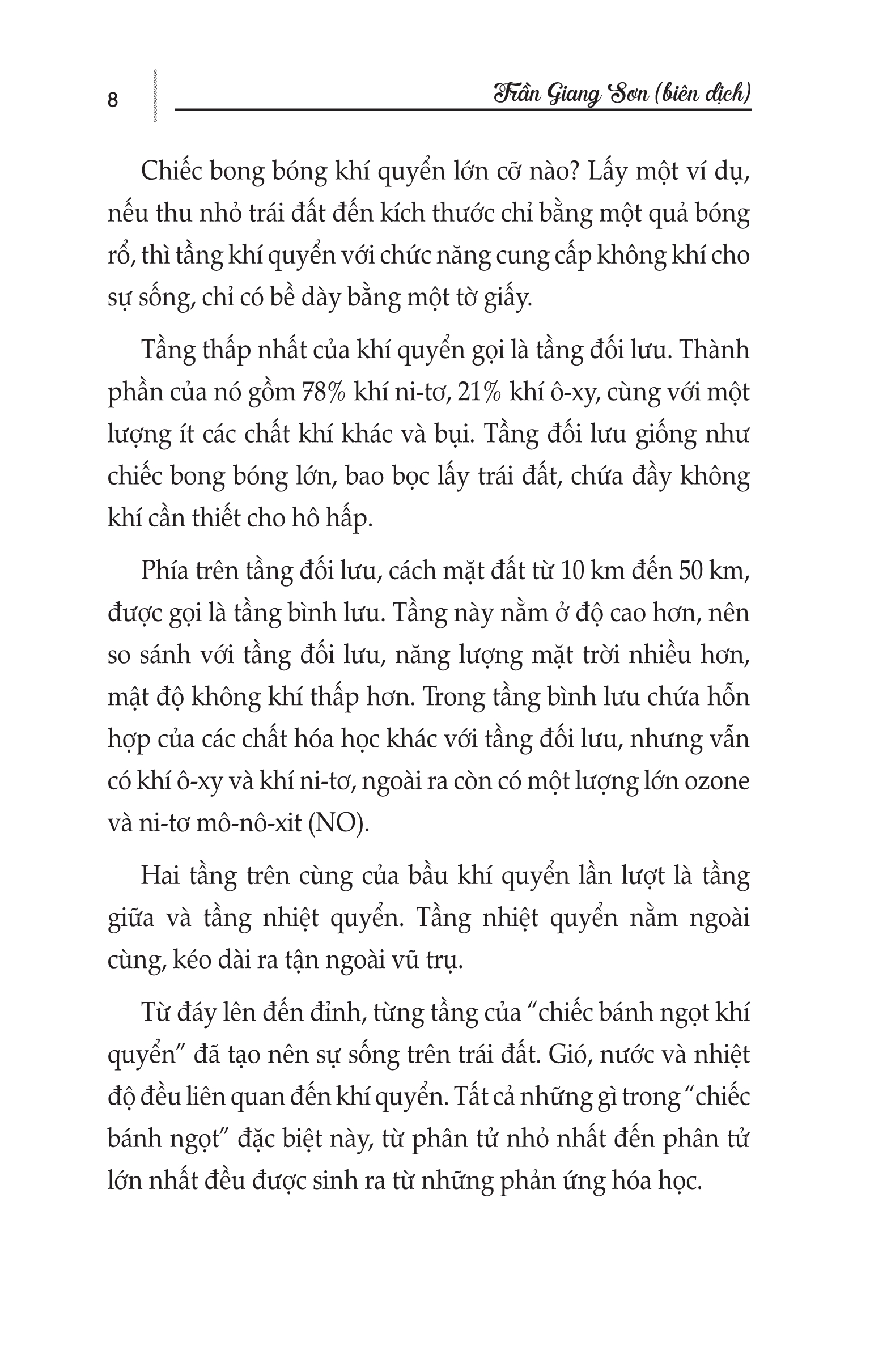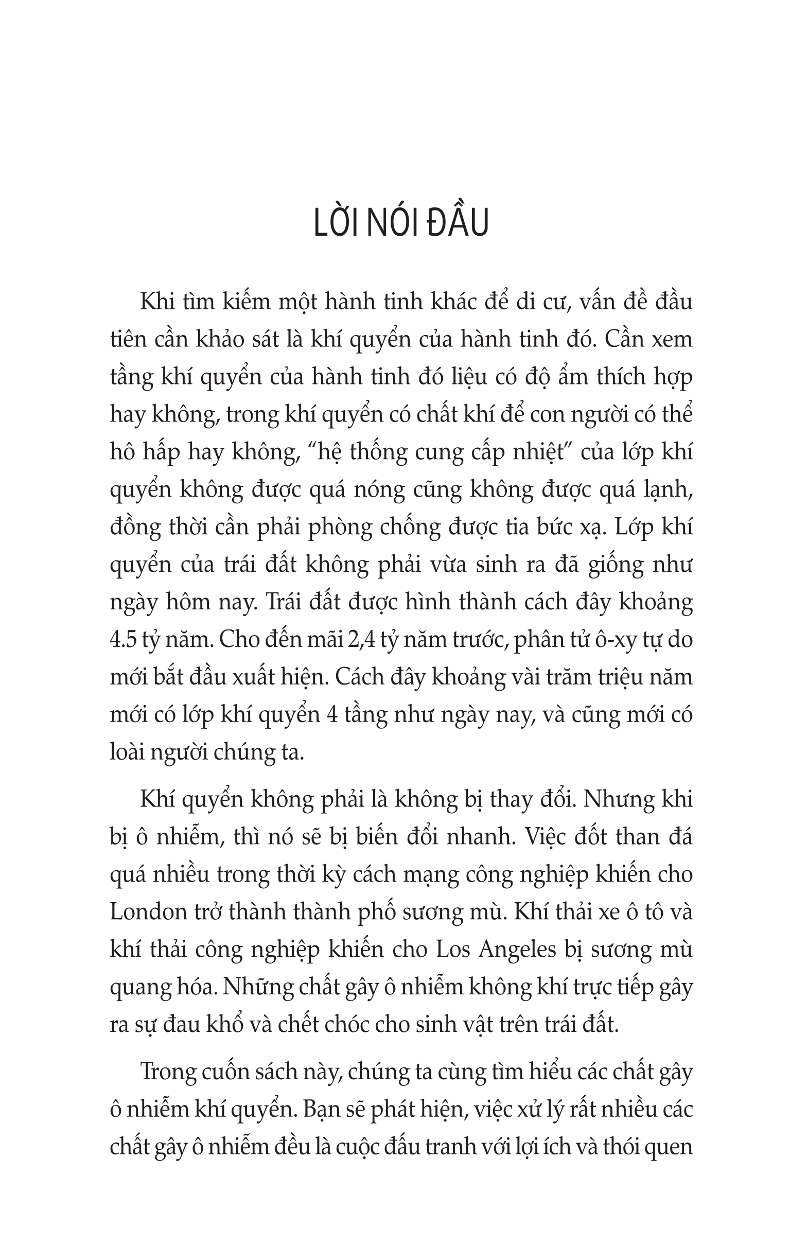 Trong cuốn sách này, chúng ta cùng tìm hiểu các chất gây ô nhiễm khí quyển. Bạn sẽ phát hiện, việc xử lý rất nhiều các chất gây ô nhiễm đều là cuộc đấu tranh với lợi ích và thói quen của con người. Chẳng hạn, việc nghiêm cấm sử dụng xăng chứa chì gây tổn hại cho ngành công nghiệp hóa học, việc đưa ra các tiêu chuẩn nghiêm ngặt đối với khí thải xe hơi đã đe dọa ngành công nghiệp xe hơi. Thậm chí, hạn chế lái xe hơi và đốt than, đều ảnh hưởng đến thói quen sinh hoạt của con người. Bạn cũng hiểu được rằng, bây giờ có thể dùng phương pháp gì để làm sạch khí quyển. Mỗi một đồ vật mà chúng ta sử dụng đều có nguồn gốc, và có một nơi để đi về. Chúng ta không muốn rằng cuối cùng chúng sẽ biến thành vật gây ô nhiễm. Không khí trong lành là báu vật có giá trị nhất đối với loài người.