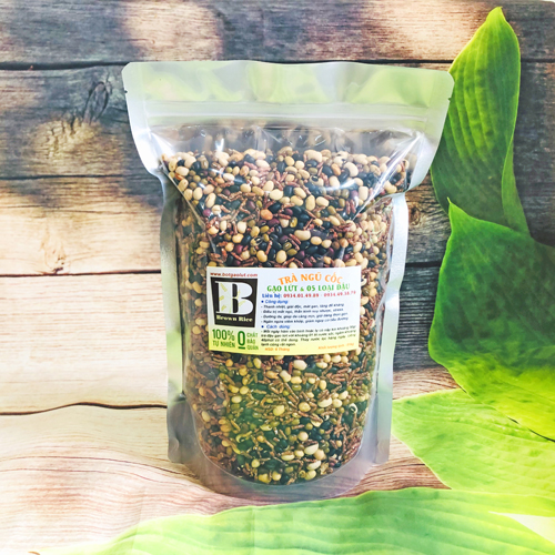 TRÀ NGŨ CỐC GẠO LỨT VÀ 5 LOẠI ĐẬU Thành phần: Gạo lứt, Đậu đỏ, Đậu xanh, Đậu đen xanh lòng, Đậu nành, Đậu trắng đã được rang chín. Gạo lứt có chứa nhiều thành