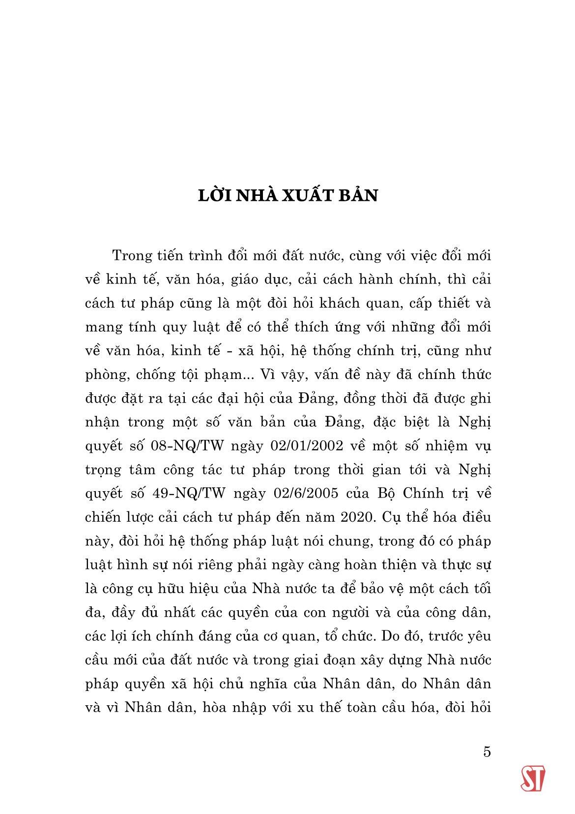 Nhằm giúp bạn đọc nói chung, những người làm công tác pháp luật nói riêng, tìm hiểu và năm vững các quy định của Bộ luật Hình sự và Bộ luật Tố tụng hình sự