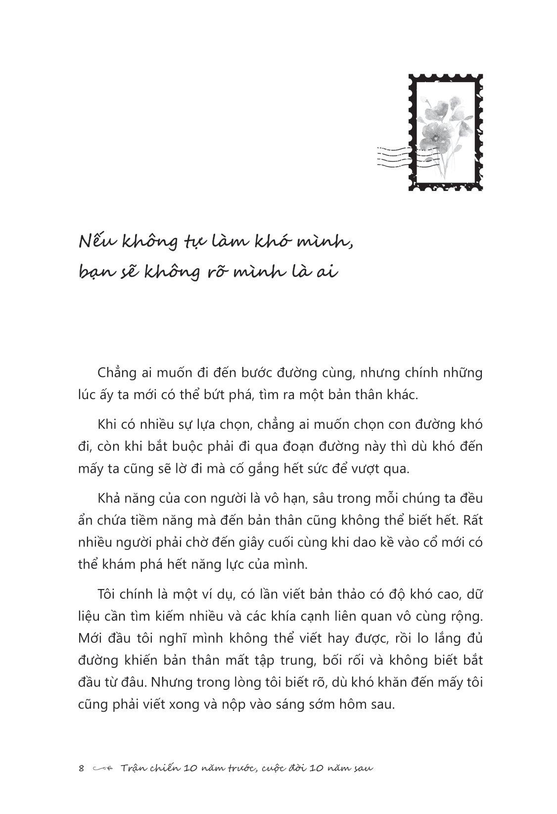 Trận Chiến 10 Năm Trước, Cuộc Đời 10 Năm Sau “Nếu chúng ta cho rằng bình phàm là đáng quý, ta sẽ hài lòng với bản thân của hiện tại, lựa chọn những điều dễ dàng, sống cho qua ngày mà quên mất trên đời có những người không màng tất cả để sống đời huy hoàng rực rỡ.” Các bạn trẻ, tương lai của các bạn đang được xây dựng và tích lũy dựa trên những quyết tâm ở ngay giây phút này. Vậy nên tuổi trẻ đừng chọn an nhàn, đừng tính toán thiệt hơn, đừng trì hoãn các mục tiêu, đừng nhụt chí sau thất bại. Trận chiến 10 năm trước chính là cuộc đời của bạn 10 năm sau!