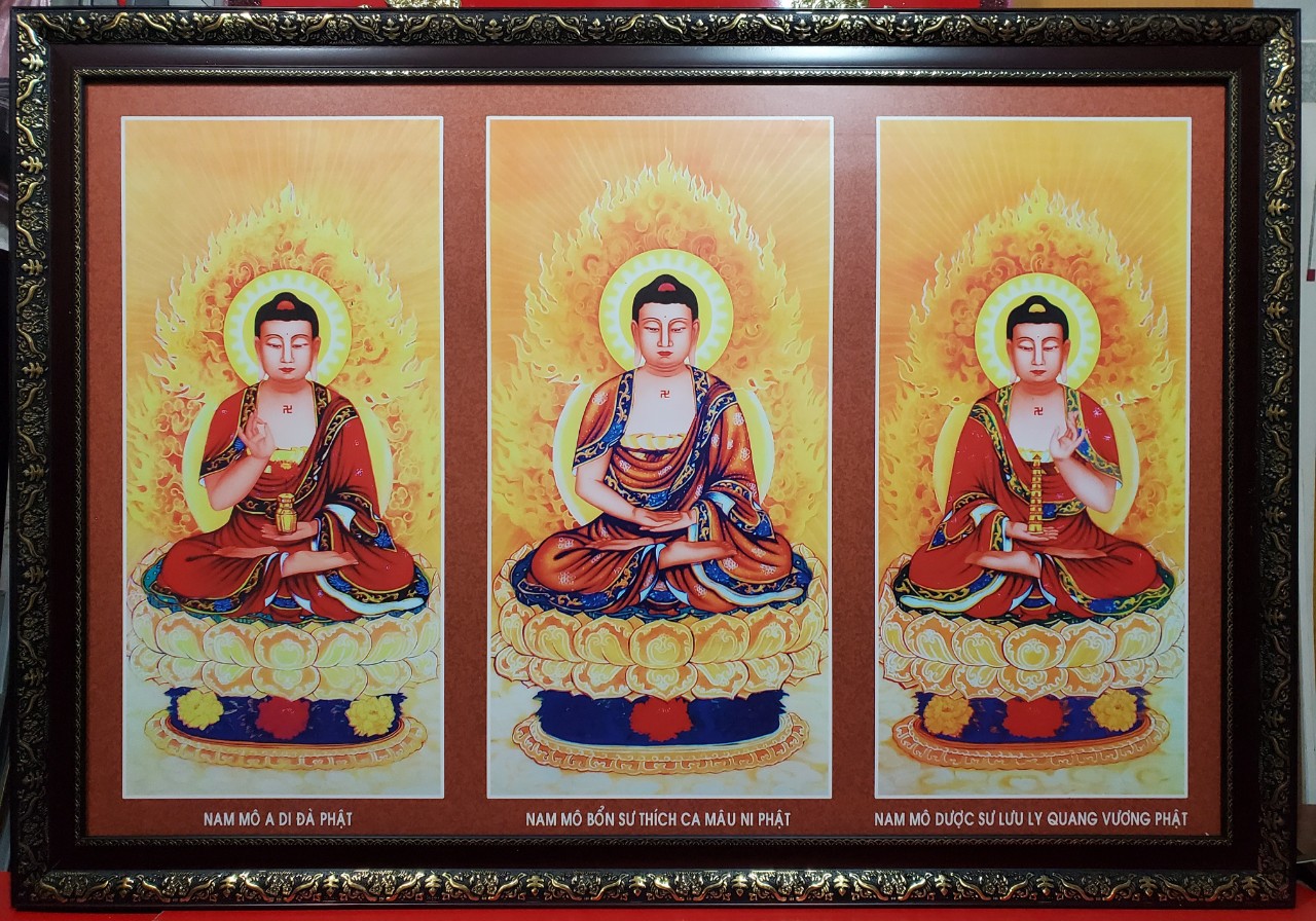 TRANH PHẬT TAM THÁNH - TAM THÁNH PHẬT Chất liệu tranh in dầu trên màng lụa cao cấp được cán phủ lớp màng PE bảo vệ bề mặt tranh, dán ép trên tấm pormex dày 5mm độ bền màu đảm bảo trên 10 năm hình ảnh vẫn như mới. Tấm formex có trọng lượng nhẹ, không cong vênh chịu mọi thời tiết nóng , lạnh nồm ẩm, không thấm nước, dễ lau chùi bằng khăn ướt, không độc hại. Khung bao tranh, bằng nhựa compoxit màu vân gỗ bền đẹp mãi với thời gian. Kích thước phủ khung 70*110cm