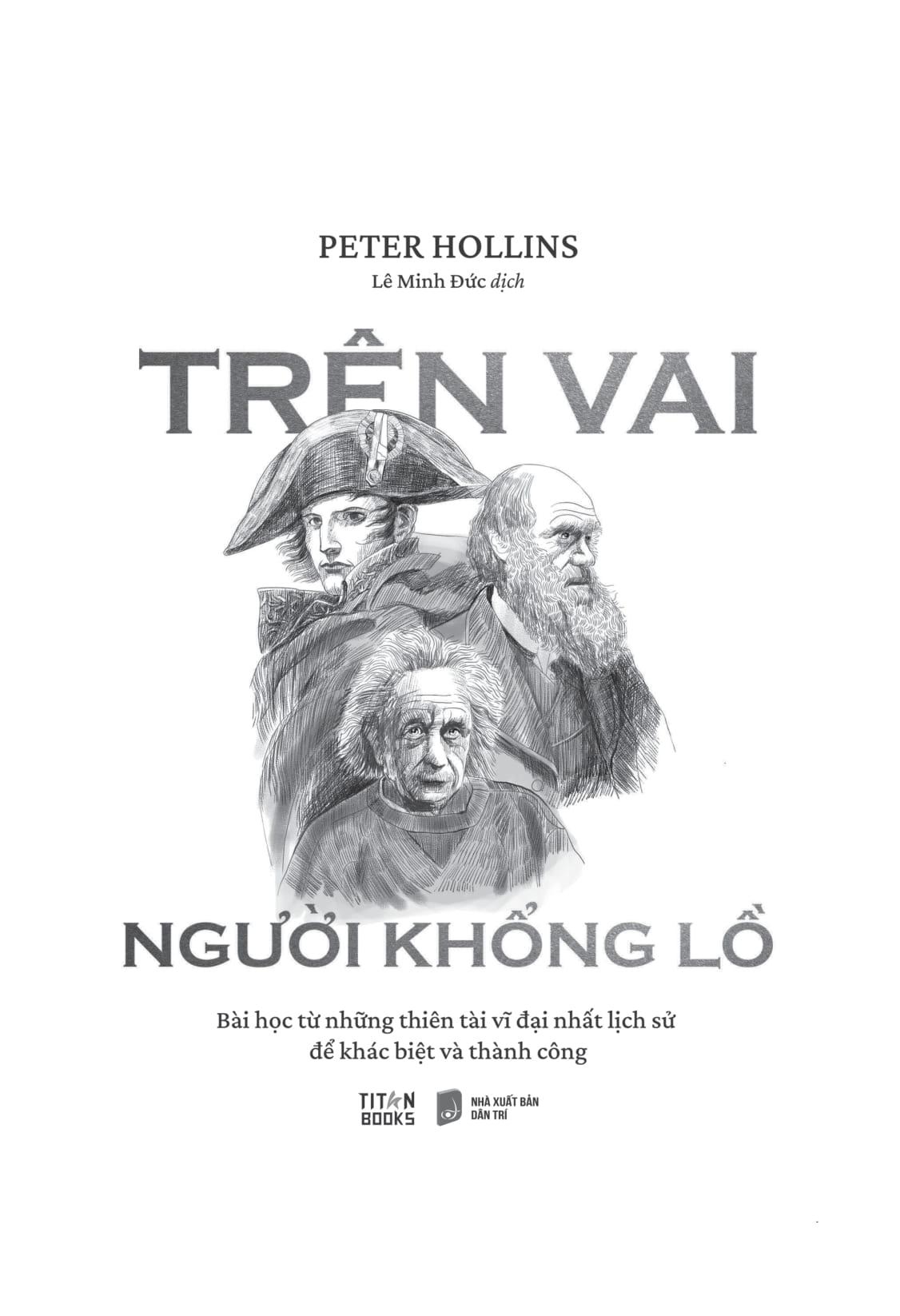 Trong cuốn sáchTrên vai người khổng lồ - Bài học từ những thiên tài vĩ đại nhất lịch sử để khác biệt và thành công, tác giả Peter Hollins sẽ cho bạn nhìn xuyên qua thời gian và không gian, chứng khiến các dấu mốc cuộc đời của nhiều nhà tư tưởng vĩ đại như Albert Einstein, Socrates, Charles Darwin, Abraham Lincoln,... Từ đó khám phá những đặc điểm đặc trưng và khác biệt trong tư duy khiến họ trở thành những thiên tài bậc nhất, khai thác các phương pháp và kĩ năng độc đáo mà chúng ta có thể tích lũy và học tập.