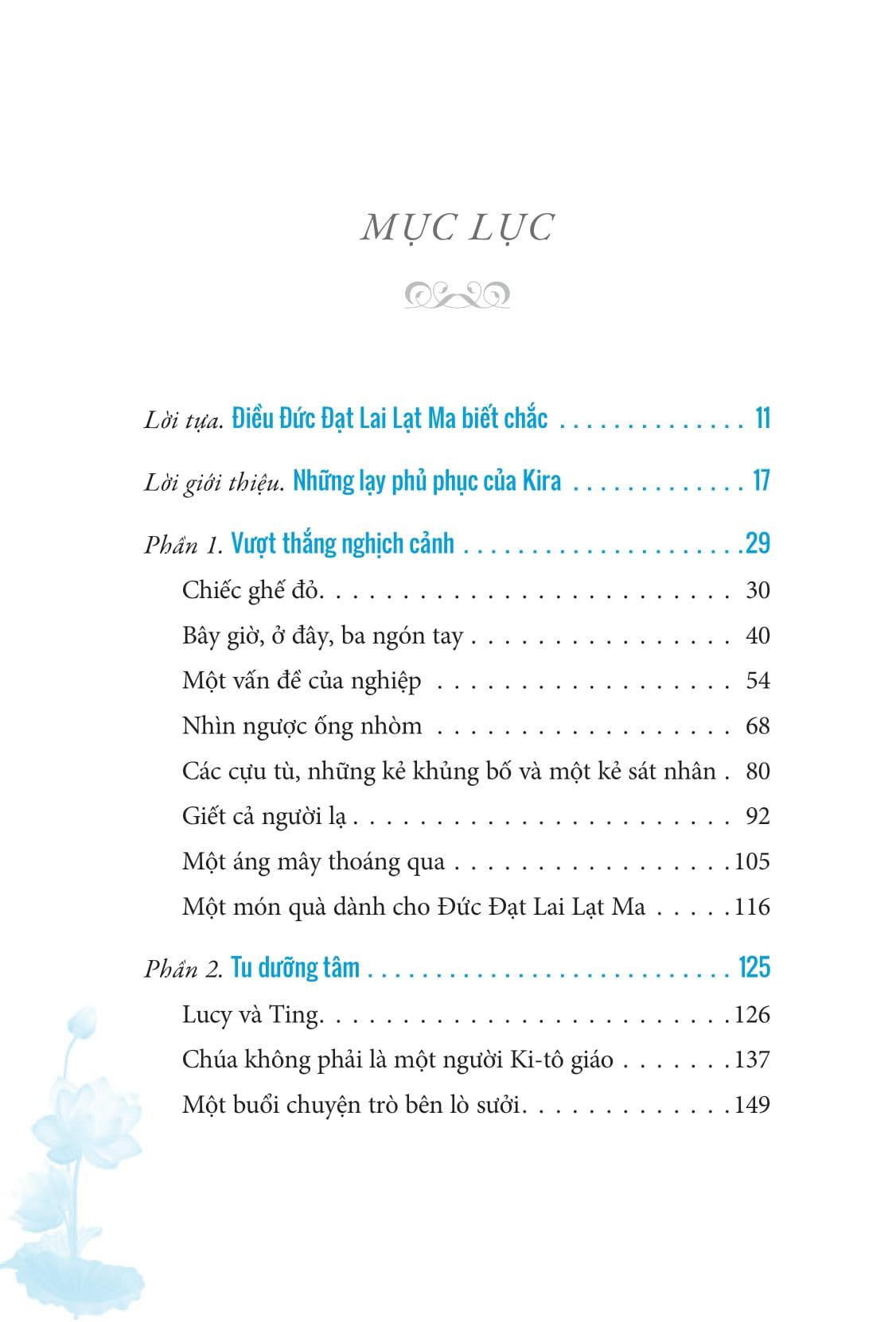 Ba phần của cuốn sách này phản ánh ý niệm về từ bi trong tư duy (Vượt thắng nghịch cảnh), lời nói (Tu dưỡng tâm), và hành động (Từ bi trong hành động).