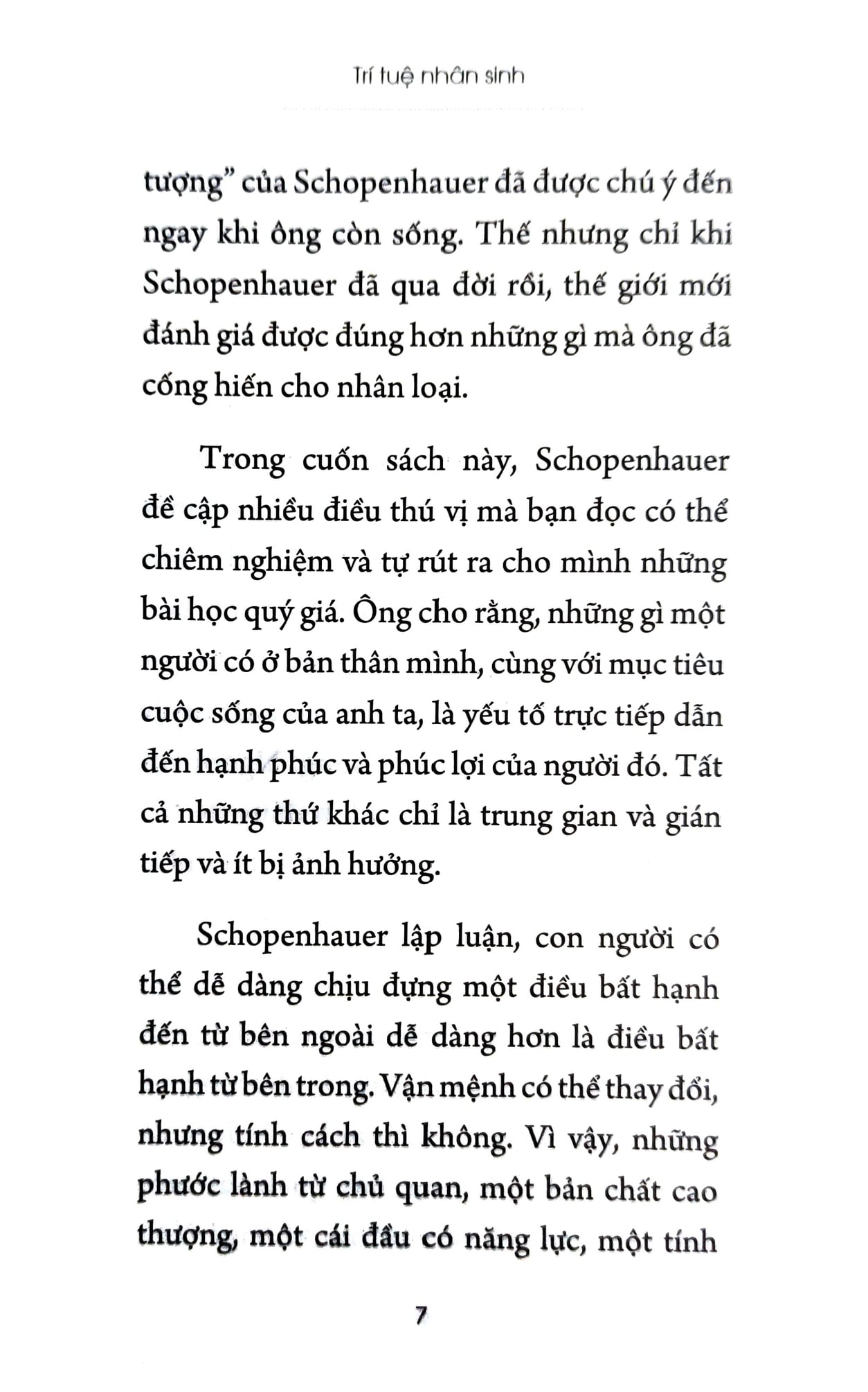 Trí Tuệ Nhân Sinh GIỚI THIỆU TÁC GIẢ: Arthur Schopenhauer, một trong những triết gia vĩ đại của nước Đức, nổi tiếng với những quan điểm đầy sáng tạo và phản biện sâu sắc về cuộc sống và nhân sinh. Ông được biết đến với việc khuyến khích một lối sống đơn giản, khổ hạnh và chay tịnh, mặc dù trong cuộc sống cá nhân ông lại thích ăn thịt, uống rượu vang và mê mẩn phụ nữ. Schopenhauer đã mở rộng và phát triển triết lý Kant về cách con người trải nghiệm thế giới, đặc biệt là trong việc khám phá sâu sắc về bản chất của khổ đau và sự vô ích trong cuộc sống. Triết gia này không chỉ nổi tiếng với sự độc lập tư tưởng mà còn với sự dám nghĩ, dám nói và sự sâu sắc về tâm lý con người, tạo nên dấu ấn sâu sắc trong lịch sử triết học thế giới. GIỚI THIỆU TÁC PHẨM: TRÍ TUỆ NHÂN SINH – CUỘC DẠO CHƠI CỦA MỘT “ĐỘC CÔ” GIỮA CUỘC ĐỜI. Trí Tuệ Nhân Sinh của Arthur Schopenhauer là một tác phẩm triết học sâu sắc về hạnh phúc và ý nghĩa cuộc sống. Trong cuốn sách này, Schopenhauer đề cập nhiều điều thú vị mà bạn đọc có thể chiêm nghiệm và tự rút ra cho mình những bài học quý giá. Ông cho rằng, những gì một người có ở bản thân mình, cùng với mục tiêu cuộc sống của anh ta, là yếu tố trực tiếp dẫn đến hạnh phúc và phúc lợi của người đó. Tất cả những thứ khác chỉ là trung gian và gián tiếp và ít bị ảnh hưởng. Schopenhauer lập luận, con người có thể dễ dàng chịu đựng một điều bất hạnh đến từ bên ngoài dễ dàng hơn là điều bất hạnh từ bên trong. Vận mệnh có thể thay đổi, nhưng tính cách thì không. Vì vậy, những phước lành từ chủ quan, một bản chất cao thượng, một cái đầu có năng lực, một tính khí vui vẻ, tinh thần trong sáng, một thể chất khỏe mạnh, là những yếu tố đầu tiên và quan trọng nhất của hạnh phúc. “Đừng nên kỳ vọng nhiều vào người khác, hay nói chung là đừng nên kỳ vọng từ thế giới bên ngoài” – như một châm ngôn đúng với bất kỳ ai! Chính bản thân mình là nguồn gốc của những điều tốt đẹp nhất mà con người có thể đạt được. Càng đúng hơn khi khẳng định – một người càng vui vẻ hạnh phúc hơn khi tìm thấy nguồn vui trong chính mình.