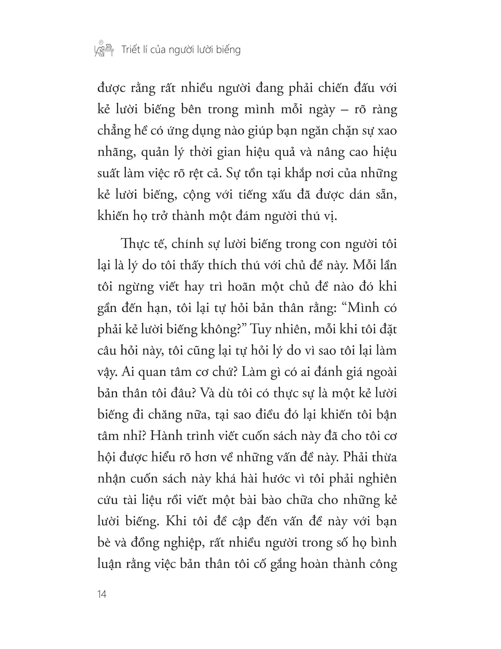 “Đừng lười biếng nữa!” Chắc hẳn đôi lúc bạn sẽ nghe ba mẹ nói vậy khi đang mải mê đắm chìm trong trò chơi nào đó. Hoặc cũng có thể bạn sẽ nghe được những lời này từ một người bạn cùng phòng khi bản thân đang nằm dài trên ghế sô pha, tay cầm điện thoại lướt ram. Hoặc đơn giản đây là lời bạn tự nhủ với chính m.ình vào những ngày bạn chẳng làm gì. Nhưng lười biếng có gì xấu đến vậy? Chẳng lẽ lúc nào bạn cũng phải thể hiện m.ình là người hữu dụng sao? Trái ngược lại với văn hóa phát huy hết hiệu suất làm việc của chúng ta, Alison Suen cảm thấy thật nực cười khi chúng ta luôn chỉ trích kẻ lười biếng – những cá nhân chỉ làm cho qua chuyện để được yên thân. Bà đưa ra phân loại những kiểu chỉ trích người lười biếng thường thấy, và biện luận rằng những đánh giá trên sai, hoặc là tiền đề của những đánh giá đó có vấn đề. Tuy cuốn sách này bào chữa cho sự lười biếng, nhưng nó không hề bênh vực lối sống lười biếng và nâng tầm nó lên thành chìa khóa hướng đến điều gì đó tốt đẹp hơn (như bước tiến mới của văn hóa hay sự tự giác ngộ bản thân gì đó), như một vài học giả vẫn nói. Trên thực tế, Suen chỉ đề cập đến việc lười biếng thể hiện độc đáo vì nó chẳng phục vụ mục đích cao cả nào. Và đây hoàn toàn không phải là sự phản đối có toan tính đối với những bất công trong xã hội, cũng chẳng phải con đường đi đến tự do ý chí nào cả. Người lười biếng chẳng qua chỉ lười biếng mà thôi. Bằng việc nghiên cứu văn hóa phát huy hiệu suất làm việc, Suen đã nhận định một thực tế rằng đôi khi lười biếng không hề xấu, vậy thôi. Trong cuốn sách này sẽ MINH OAN cho những người lười, buộc chúng ta phải cân nhắc trước khi miêu tả họ bằng những ngôn từ xấu xí. “Triết lí của người lười biếng” không phải là thứ xảo ngôn lý cùn phiến diện biện minh cho thói chây ì của một nhóm người cụ thể, mà là một phân tích triết học dựa trên những bằng chứng khoa học có cơ sở về một chủ đề mà bấy lâu nay người ta vẫn dè bỉu khi nhắc đến – LƯỜI BIẾNG. Với ngôn từ linh hoạt nhưng không kém phần dí dỏm và hài hước, Alison Suen đã thực sự khiến những “người lười” bớt cô đơn. Thông tin tác giả: Alison Suen là phó Giáo sư chuyên ngành Triết học tại Đại học Iona, New York. Bà cũng là tác giả của cuốn The Speaking Animal: Ethics, Language and the Human-Animal Divide (tạm dịch: Ngôn ngữ loài vật: Văn hóa, ngôn ngữ và sự phân chia Người-Vật) (2015) và cuốn Response Ethics (tạm dịch: Văn hóa phản ứng) (2018).