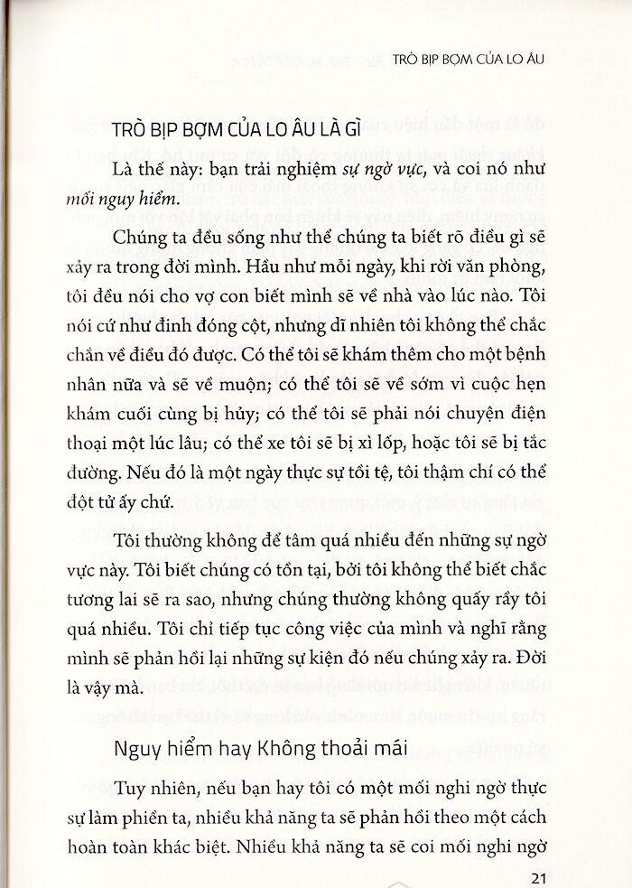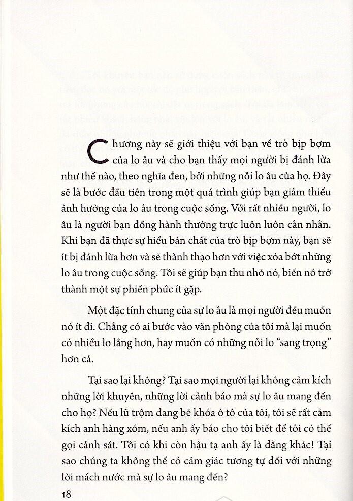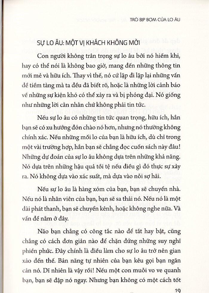 Trò Bịp Bợm Của Lo Âu - The Worry Trick Những ai nên đọc cuốn sách này? Đó là những người lo lắng quá nhiều, lo lắng về những nỗi lo lắng của họ, yêu thương những người hay lo lắng, hoặc đang đều trị cho những những hay lo lắng. Cuốn sách này dành cho những người chưa từng cân nhắc sẽ đọc một cuốn sách self-help và những người đã đọc cả chồng sách thuộc thể loại này. Nó dành cho những người chưa từng một lần tham gia trị liệu, người đang được trị liệu, và cả những người từng được đều trị nhưng kết quả thu được chỉ là nỗi thất vọng. Ngay cả những người từng thử liệu pháp nhận thức - hành vi và sử dụng thuốc mà chỉ thấy chúng phần nào có hiệu quả cũng sẽ tìm thấy trong cuốn sách này một thứ gì đó mới mẻ và đem lại sự tự do.