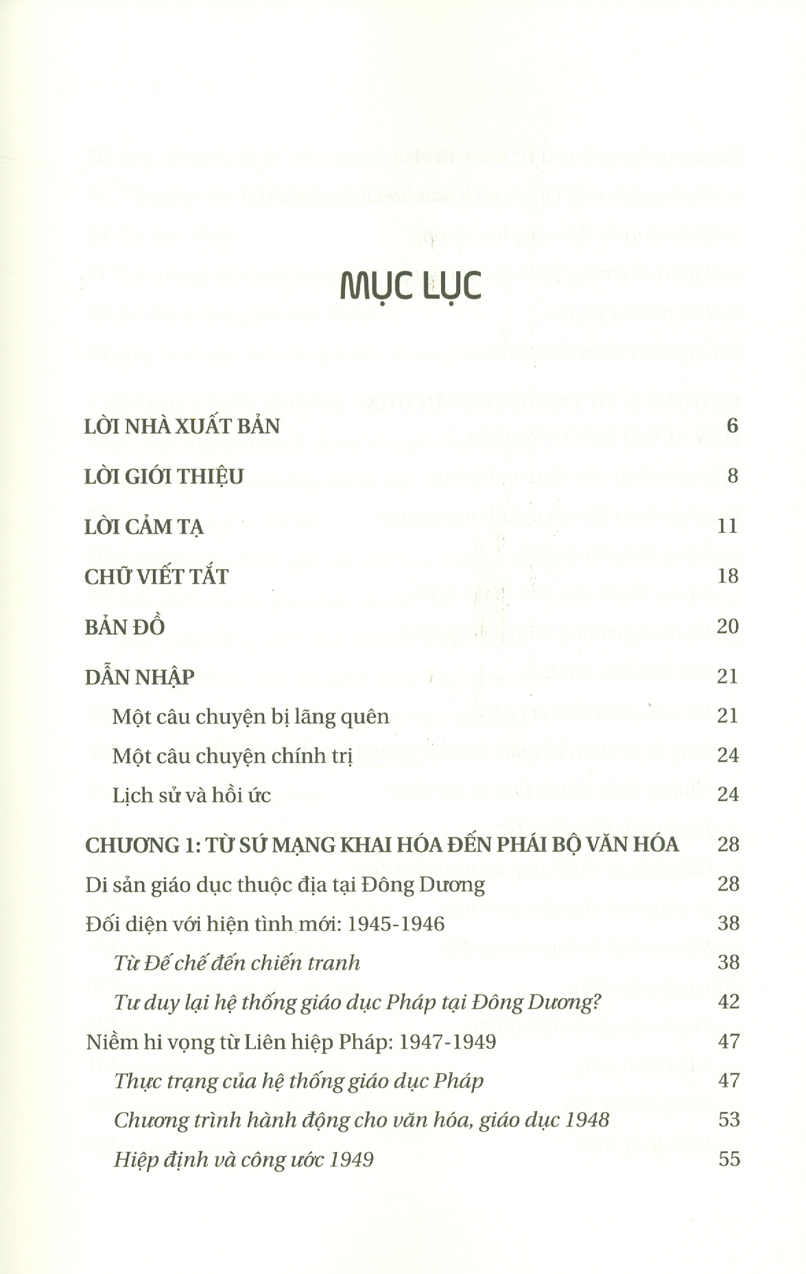 Cuốn sách giới thiệu cô đọng những đặc điểm căn bản của giáo dục Đông Dương thuộc địa, giúp độc giả khám phá tiến trình ít nhiều bị cưỡng ép để biến “sứ mạng khai hóa” thành một thứ “Phái bộ văn hóa” thích ứng linh động hơn với điều kiện chính trị và chiến cuộc từ 1945 đến 1954. Đồng thời phân tích sự phát triển của hệ thống trường Pháp tại miền Nam từ 1954 đến 1975 trong bộ “áo choàng ngoại giao” mới dưới thời chính quyền Việt Nam Cộng hòa có sự hậu thuẫn của Mỹ.