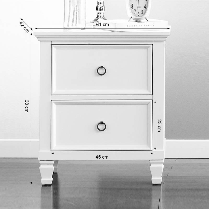 Chất liệu chính: Gỗ cao su; Màu sắc: Màu trắng; Thời hạn bảo hành: 24 tháng; Thời gian giao hàng: 7-10 ngày; Phòng chính: Phòng ngủ; Yêu cầu lắp đặt: Không; Bộ sưu tập: Bộ Tamarack; Tình trạng tồn kho: Đặt đóng; Phong cách: Classic; Hoàn thiện: Sơn PU; Kích thước (mm): 610 x 432 x 686; Chức năng: Tủ ngăn kéo; Loại sản phẩm: Tủ; Xuất xứ: Việt Nam; Đơn vị tính: Cái; Kiểu dáng: 2 ngăn;