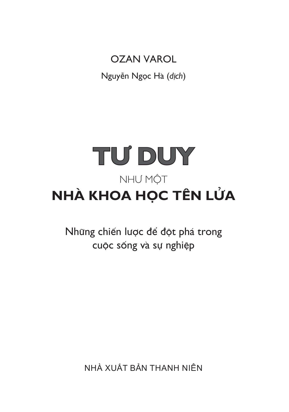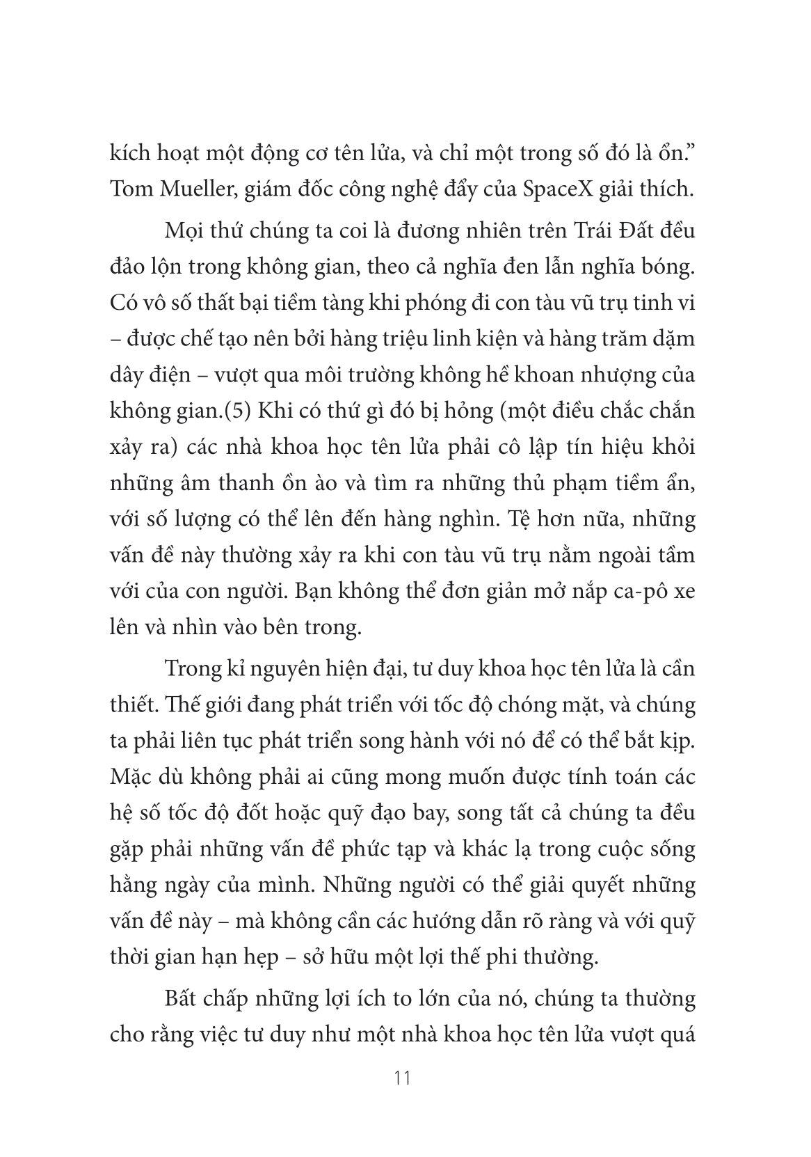 Tư duy như một nhà khoa học tên lửa là nhìn thế giới qua một lăng kính khác. Các nhà khoa học tên lửa hình dung ra những điều không tưởng và giải quyết những điều không thể giải quyết. Họ biến thất bại thành thành công và khó khăn thành lợi thế. Họi coi những rủi ro như những câu đố có thể giải được hơn là những rào cản không thể vượt qua. Họ hành động không phải bởi sự tin tưởng mù quáng mà bởi sự nghi ngờ chính bản thân; mục tiêu của họ không phải là kết quả trước mắt mà là đột phá lâu dài. Họ biết rằng các quy tắc không được thiết lập sẵn, điều mặc định có thể được thay đổi và một con đường mới có thể được tạo ra.