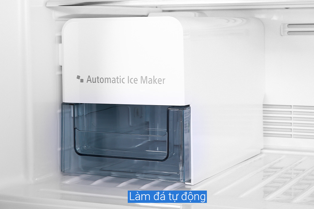 - Khay làm đá tự động: Nước được bơm từ hộc chứa ở ngăn lạnh liên tục lên khay chứa ở ngăn đông để tạo những viên đá nhỏ, đá tinh khiết sẽ tự rơi xuống khay chứa, luôn sẵn đá lạnh để sử dụng.