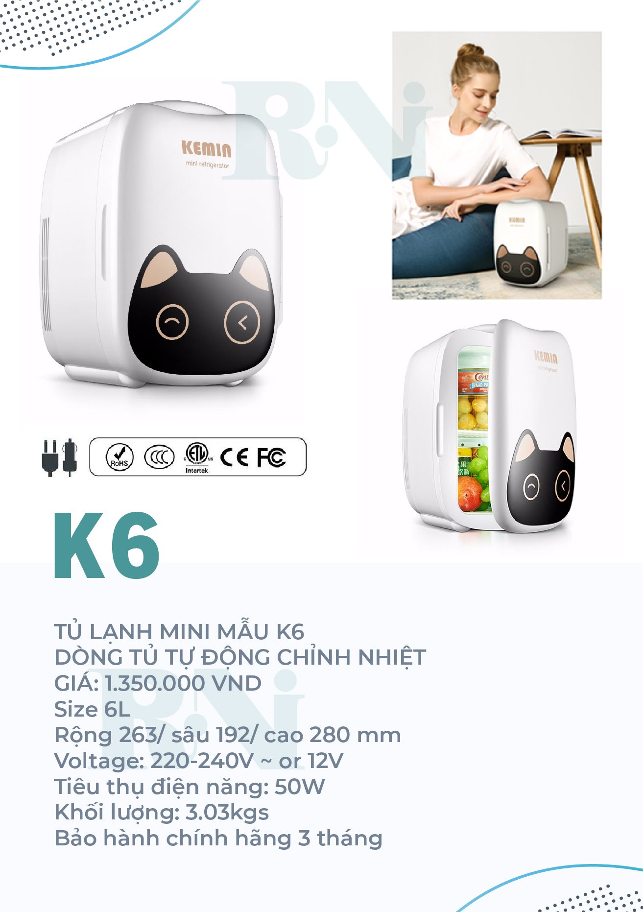 TỦ LẠNH MINI KEMIN 6L LÀ DÒNG TỦ TỰ ĐỘNG kích thước: 27x23x34 cm Dùng được cả ở nhà (220V-50W) và trên ô tô (12V) 2 chế độ làm nóng (60-65 độ) và làm lạnh (5-15 độ) Lưu ý: Do tủ sử dụng công nghệ làm lạnh bán dẫn nên sẽ xảy ra hiện tượng ngưng tụ hơi nước, khách hàng cần vệ sinh thường xuyên hoặc lót khăn dưới đáy tủ cho thấm hút nước TỦ LẠNH MINI KEMIN VIỆT NAM do Công ty CP Đầu tư Quốc tế RNI nhập khẩu và phân phối chính hãng tại Việt Nam Vậy tủ mini kemin phù hợp với những đối tượng nào ️ Tủ thích hợp cho các bà mẹ đang cho con bú để bảo quản sữa sử dụng trong ngày. Phù hợp cho các chị em bảo quản nhiều loại mỹ phẩm. ️️ ️️ Tủ nhỏ gọn nên nên nhiều mẹ mua để mang đến cơ quan, văn phòng phục vụ nhu cầu lưu trữ thực phẩm, đồ dùng cá nhân Tủ có thể Cắm điện trên xe ô tô, phù hợp để bảo quản đồ ăn, thức uống, mỹ phẩm của cả gia đình trong các chuyến du lịch, dã ngoại ️️ Tủ có 2 ổ cắm, 2 dây cắm cho điện 12V của ô tô và điện 220v sử dụng sinh hoạt gia đình. Thương hiệu: Kemin HongKong Tủ lạnh mini kemin có đủ các size 6L/10L/16L/22L/25L