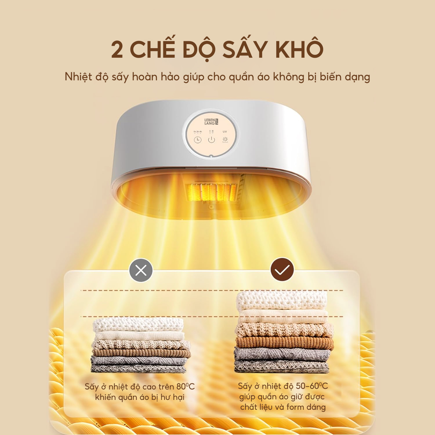 - Tủ Sấy Quần Áo Lebenlang LBL6268 tích hợp công nghệ diệt khuẩn bằng tia UV mạnh mẽ, giúp loại bỏ vi khuẩn và nấm mốc gây mùi hôi đến 89%. Bạn sẽ luôn cảm thấy tự tin và thơm tho với quần áo sạch sẽ