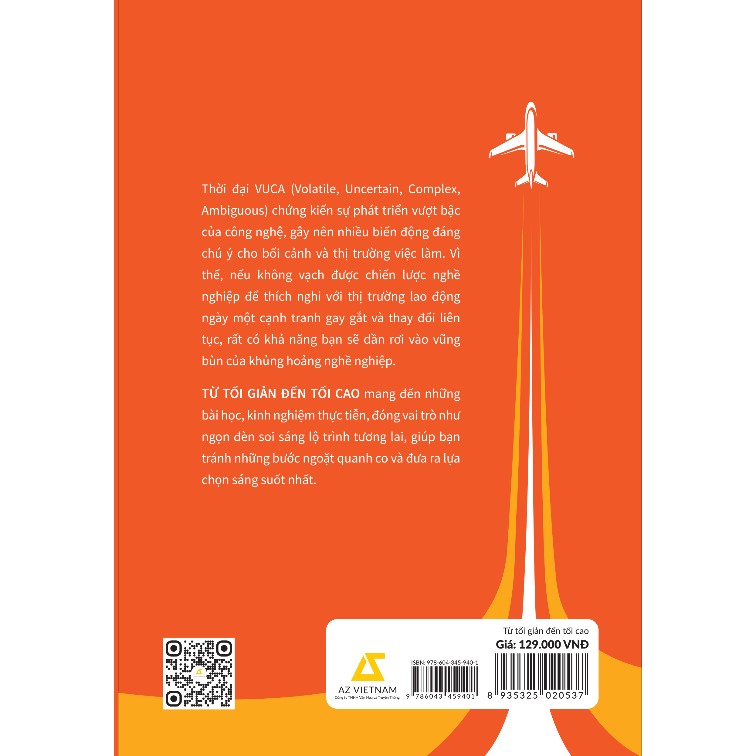 Từ tối giản đến tối cao tổng hợp các bài học được tác giả đúc kết từ kinh nghiệm tư vấn nghề nghiệp thực tế, giúp người đọc có một cái nhìn bao quát về hiện trạng nền kinh tế và thị trường lao động trong thời đại VUCA (Volatile, Uncertain, Complex, Ambiguous) đầy biến động và cạnh tranh gay gắt, qua đó trang bị những kỹ năng và vạch ra được lộ trình đúng đắn cho tương lai.