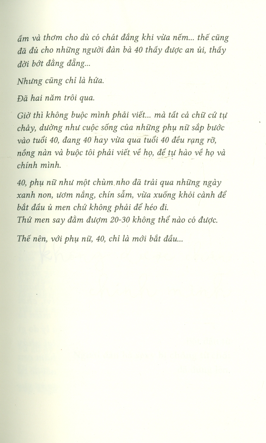 40, ta thấy mình như một chùm nho đã trải qua những ngày xanh non, ươm nắng, chín sẫm, vừa xuống khỏi cành để bắt đầu ủ men chứ không phải để héo đi. Thứ men say đằm đượm