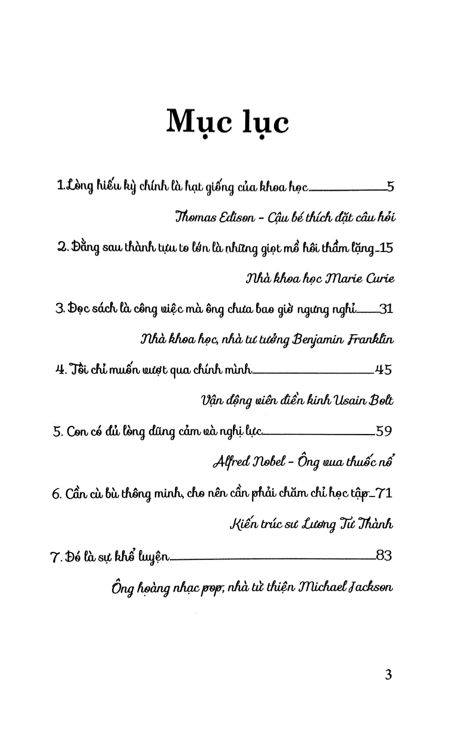 Vậy, họ đã làm thế nào để có thể chạm tới ngưỡng cửa của thành công? Newton đã làm thế nào để phát hiện ra định luật vạn vật hấp dẫn nổi tiếng trong vật lý học? Pierre Curie và Marie Curie làm gì để tìm ra hai nguyên tố phóng xạ polonium và radium? Điều gì đã khiến Andersen viết ra được những câu truyện được hàng triệu trẻ em và người lớn trên thế giới yêu thích?...