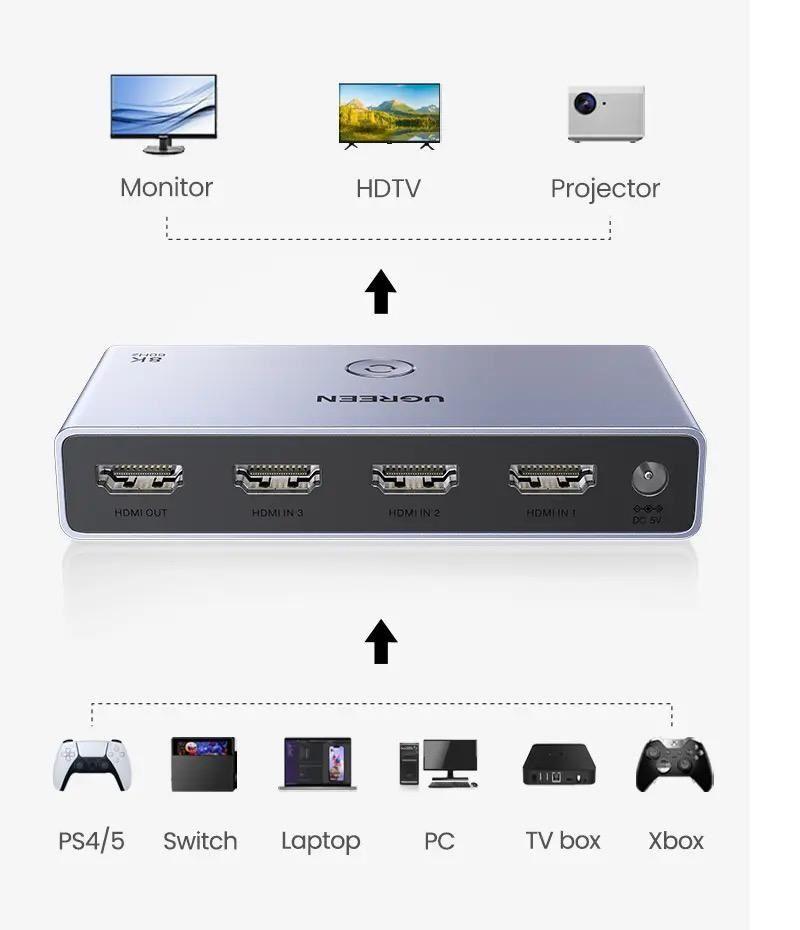 ✨Ugreen UG15604CM624TK 8K60Hz v2.1 hdmi 3 vào 1 ra có kèm remote hỗ trợ độ phân giải cao 4K120Hz có cáp nguồn USB-A to C dài 1.5M Bộ gộp HDMI - HÀNG CHÍNH HÃNG
