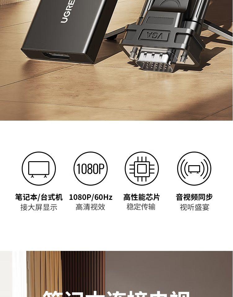 ✨Ugreen UG50945CM513TK 15CM 1920x1080 60Hz Bộ chuyển đổi VGA sang HDM kèm cáp nguồn USB-C dài 1M + cổng 3.5mm Màu Đen - HÀNG CHÍNH HÃNG