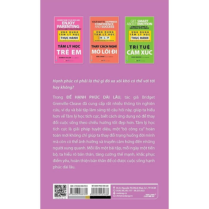 Ứng Dụng Tâm Lý Học Tích Cực - Để Hạnh Phúc Dài Lâu Hạnh phúc có phải là thứ gì đó xa xôi khó có thể với tới hay không? Trong Ứng Dụng Tâm Lý Học Tích Cực - Để Hạnh Phúc Dài Lâu tác giả Bridget Grenville-Cleave đã cung cấp rất nhiều thông tin nghiên cứu, ví dụ và bài tập làm sáng tỏ những câu hỏi này, giúp ta hiểu hơn về Tâm lý học tích cực, biết cách ứng dụng nó để thay đổi cuộc sống theo chiều hướng tốt đẹp hơn. Tâm lý học tích cực là giải pháp tuyệt diệu, một “bộ công cụ” hoàn toàn mới không chỉ giúp ta thay đổi trạng huống đời mình mà còn có thể ảnh hưởng và truyền cảm hứng đến những người xung quanh. Mỗi lần một bài tập, mỗi ngày một tiến bộ, ta hiểu rõ bản thân, tăng cường thế mạnh, khắc phục điểm yếu, hoàn thiện bản thân để có được cuộc sống hạnh phúc dài lâu.